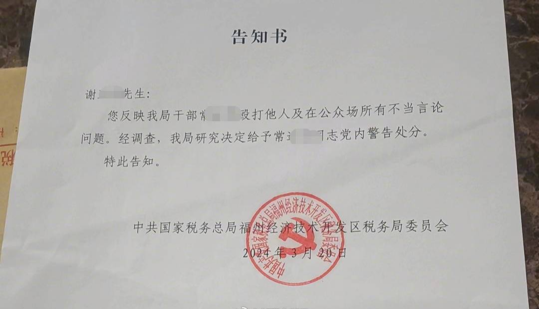 對此,福州經濟開發區稅務局工作人員稱,早前已對常某作過處罰,會針對輿情統一回覆。網傳福州經濟開發區稅務局出具的處罰告知書顯示,常某被給予黨內警告處分。