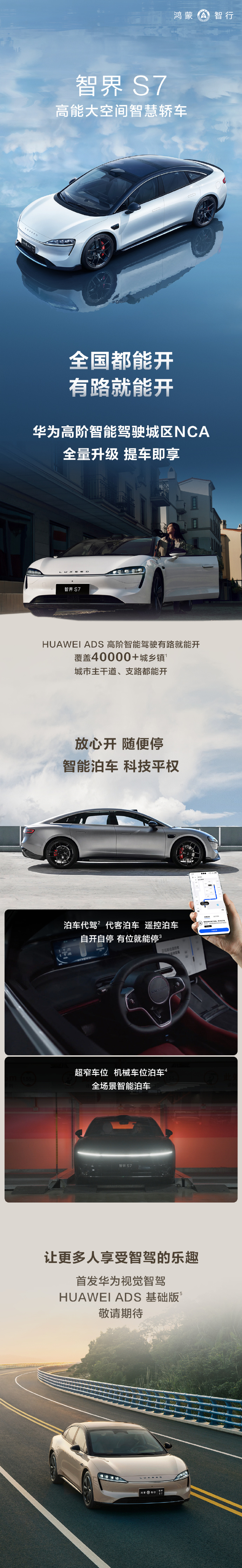 據悉,智界S7 Pro將首發搭載華為視覺智駕HUAWEI ADS基礎版,讓更廣泛的用戶都能享受到智駕的樂趣與便捷,不依賴激光雷達與高精地圖,實現「全國高速城快輕鬆開、智能泊車輕鬆停」。