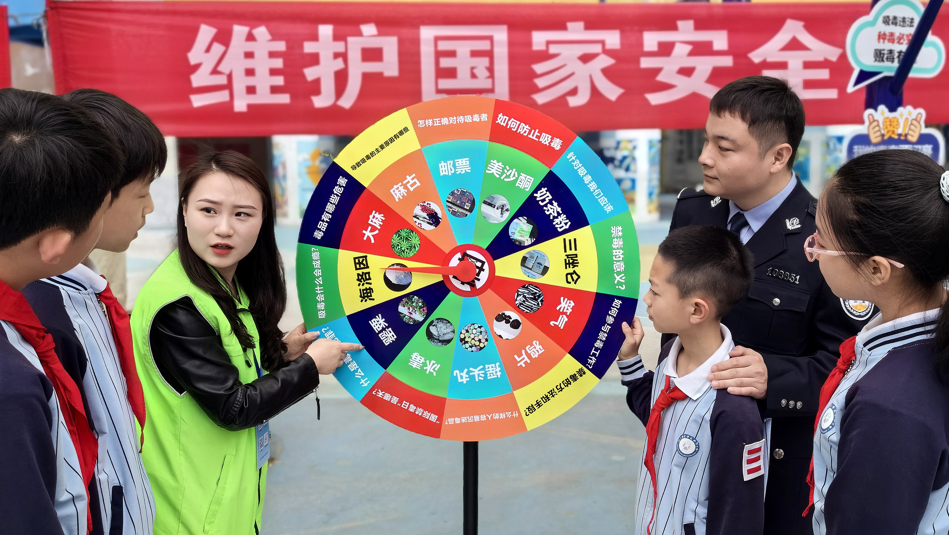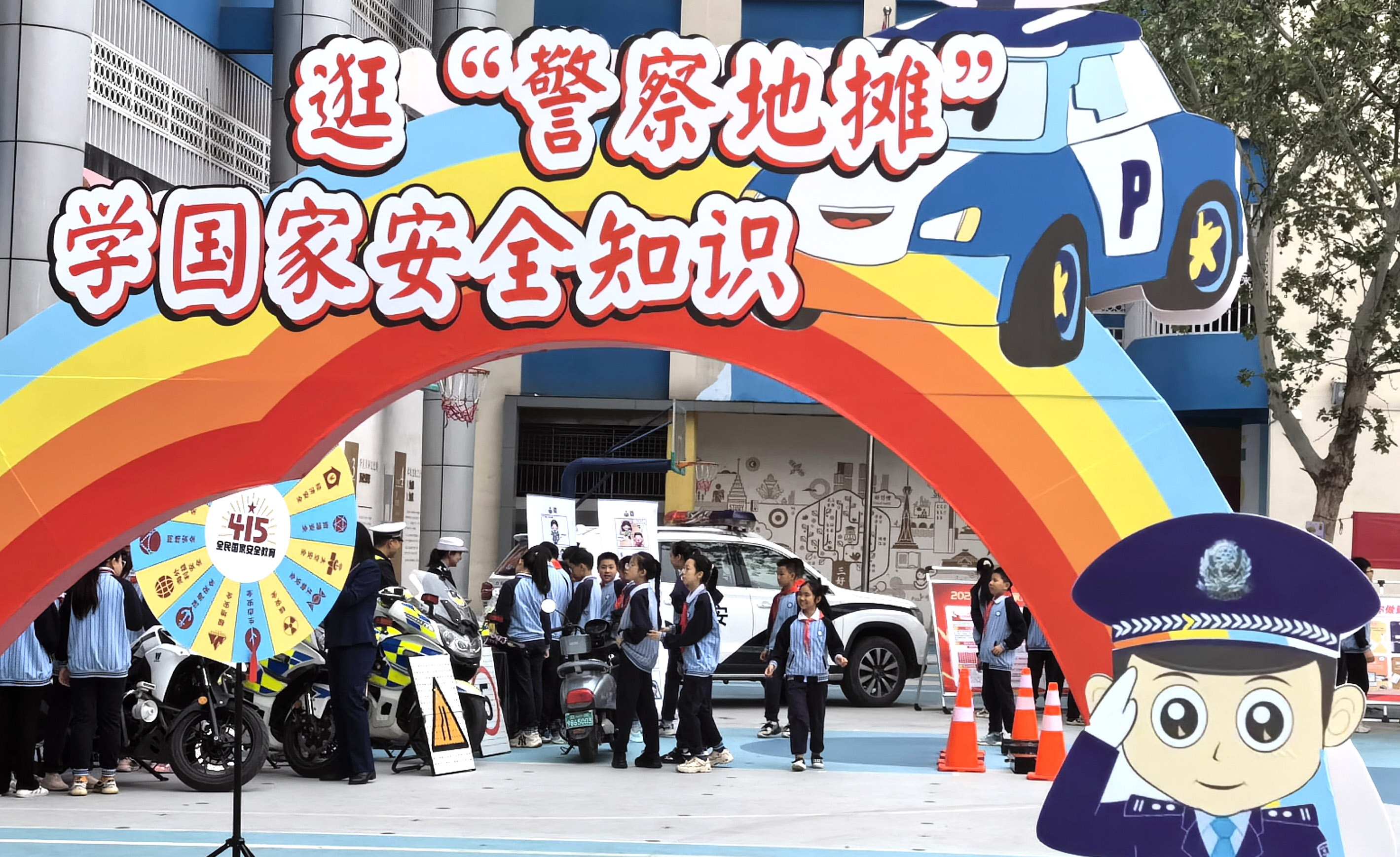 在普及國家安全知識的同時,鄭州市公安局組織特警、交警、禁毒、反詐等業務警種在學校操場擺起了「地攤兒」。