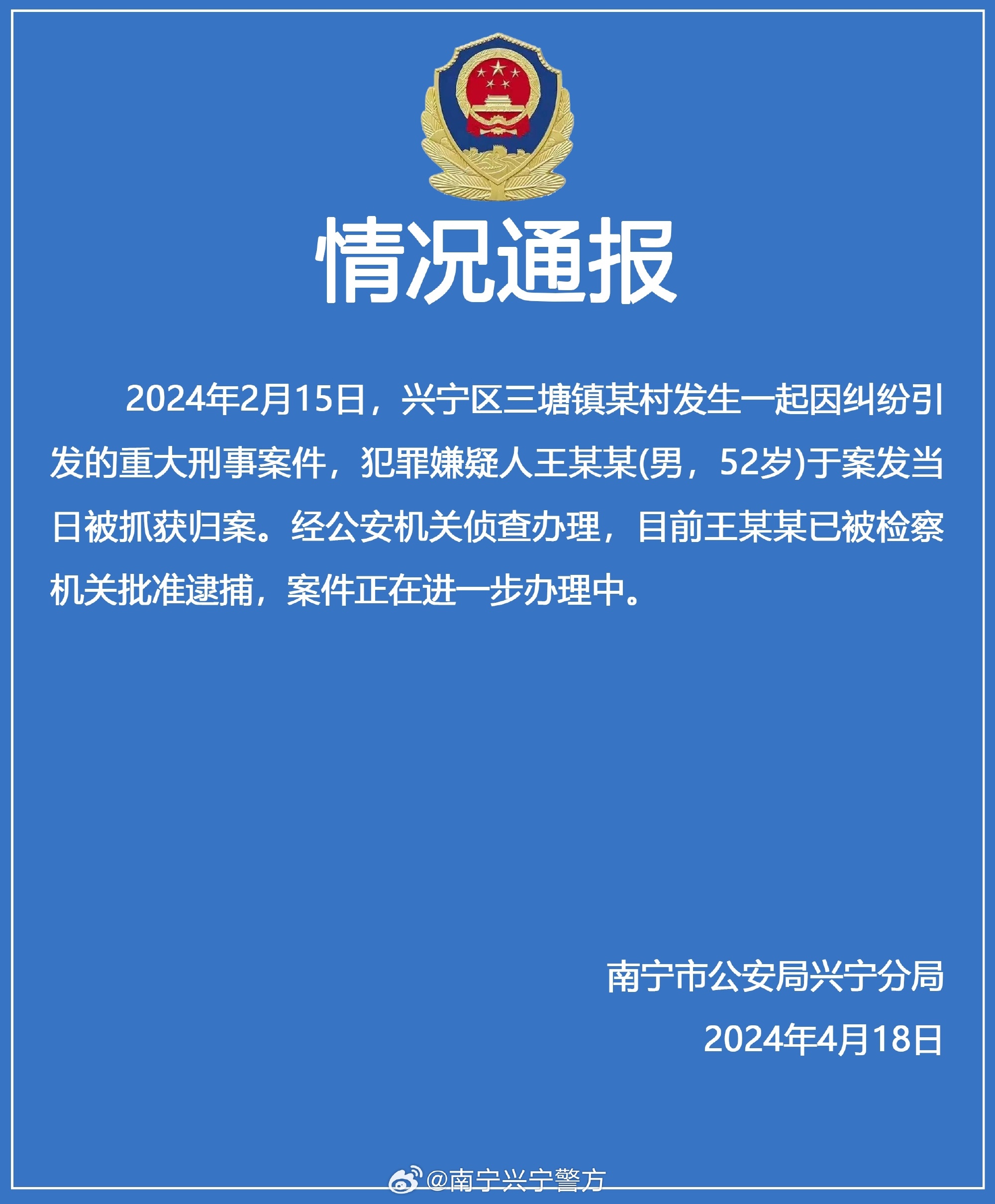 【點新聞報道】據廣西南寧興寧警方官方微博消息,2024年2月15日,南寧市興寧區三塘鎮某村發生一起因糾紛引發的重大刑事案件,犯罪嫌疑人王某某(男,52歲)於案發當日被抓獲歸案。經公安機關偵查辦理,目前王某某已被檢察機關批准逮捕,案件正在進一步辦理中。