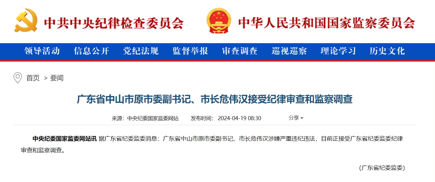 【點新聞報道】廣東省紀委監委今日(19日)消息,廣東省中山市原市委副書記、市長危偉漢涉嫌嚴重違紀違法,目前正接受廣東省紀委監委紀律審查和監察調查。
