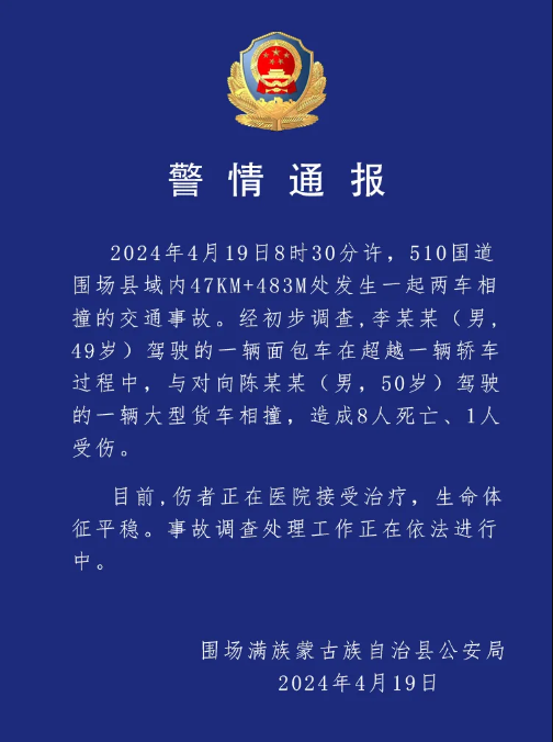 【點新聞報道】4月19日,河北省承德市圍場滿族蒙古族自治縣公安局發布通報稱,4月19日8時30分許,510國道圍場滿族蒙古族自治縣縣域內47KM+483M 處發生一起兩車相撞的交通事故。經初步調查,李某某(男,49歲)駕駛的一輛麵包車在超越一輛轎車過程中,與對向陳某某(男,50歲)駕駛的一輛大型貨車相撞,造成8人死亡、1人受傷。目前,傷者正在醫院接受治療,生命體徵平穩。事故調查處理工作正在依法進行中。