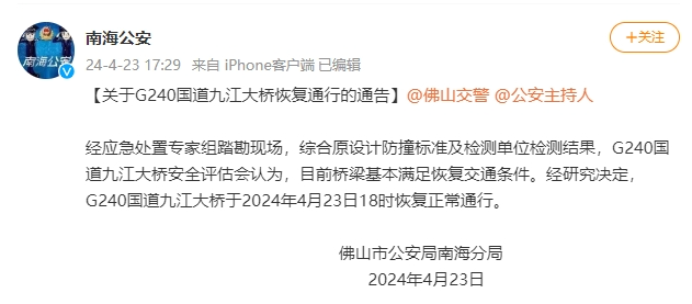 【點新聞報道】22日晚,一集裝箱貨船擦碰九江大橋防撞墩後沉沒。據佛山市公安局南海分局今日(23日)傍晚通告,經應急處置專家組踏勘現場,綜合原設計防撞標準及檢測單位檢測結果,G240國道九江大橋安全評估會認為,目前橋樑基本滿足恢復交通條件。經研究決定,G240國道九江大橋於2024年4月23日18時恢復正常通行。