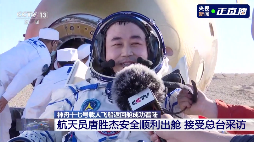 17時46分,神舟十七號載人飛船返回艙在東風着陸場成功着陸,現場醫監醫保人員確認航天員湯洪波、唐勝傑、江新林身體狀態良好,神舟十七號載人飛行任務取得圓滿成功。