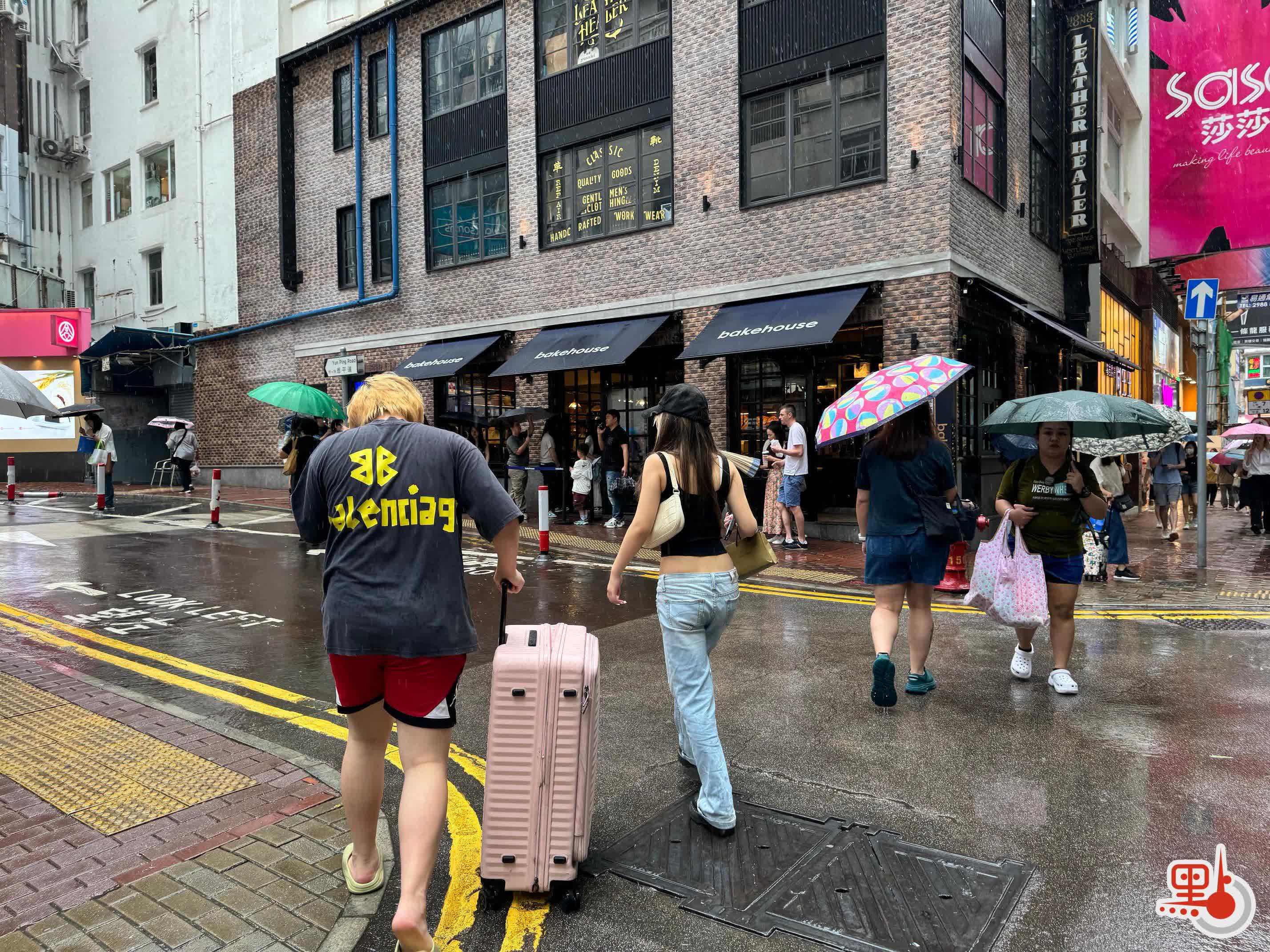 至下午4時左右,雨勢減小,銅鑼灣街頭熙熙攘攘,更加熱鬧。在銅鑼灣崇光百貨,部分名牌店需要排隊入內。位於希慎廣場外的網紅麵包店BAKEHOUSE,依舊不減人氣,仍有多人冒雨光顧。