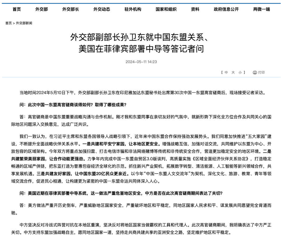 【點新聞報道】據外交部網站消息,當地時間2024年5月10日下午,外交部副部長孫衛東在印尼雅加達東盟秘書處出席第30次中國—東盟高官磋商後,現場接受記者採訪。