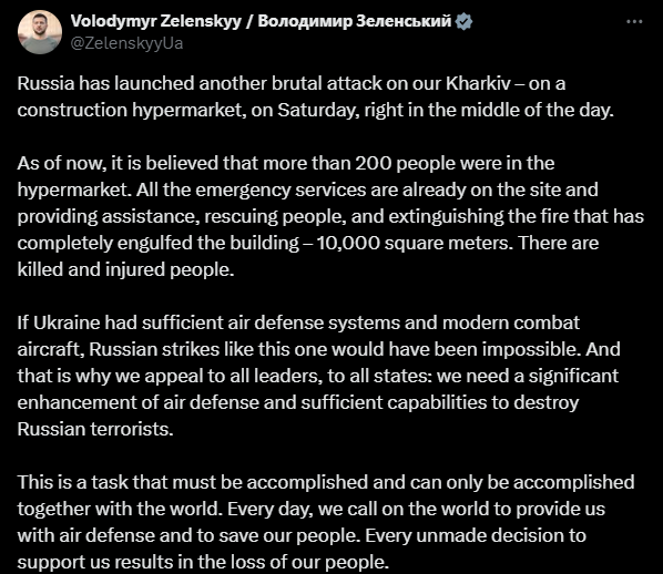 烏總統澤連斯基隨後發表聲明稱,當天中午,俄軍襲擊了哈爾科夫市的一家建材超市,並且附上相關視頻。據了解,事發時該市場內可能有超過200人。澤連斯基同時敦促盟友為烏克蘭提供足夠的防空系統。