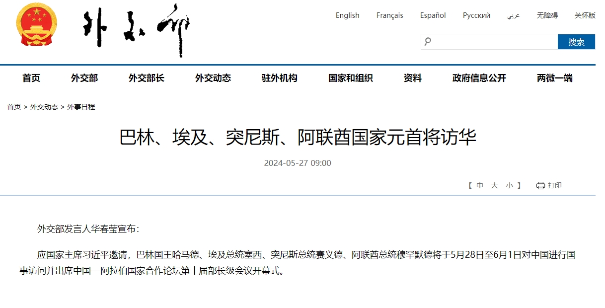 【點新聞報道】據央視新聞報道,外交部發言人華春瑩宣布:應國家主席習近平邀請,巴林國王哈馬德、埃及總統塞西、突尼斯總統賽義德、阿聯酋總統穆罕默德將於5月28日至6月1日對中國進行國事訪問並出席中國—阿拉伯國家合作論壇第十屆部長級會議開幕式。