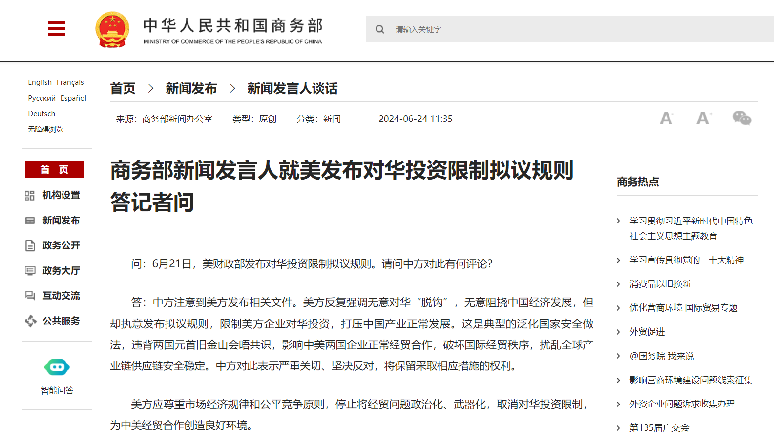 【點新聞報道】據商務部網站6月24日消息,商務部新聞發言人就美發布對華投資限制擬議規則答記者問。