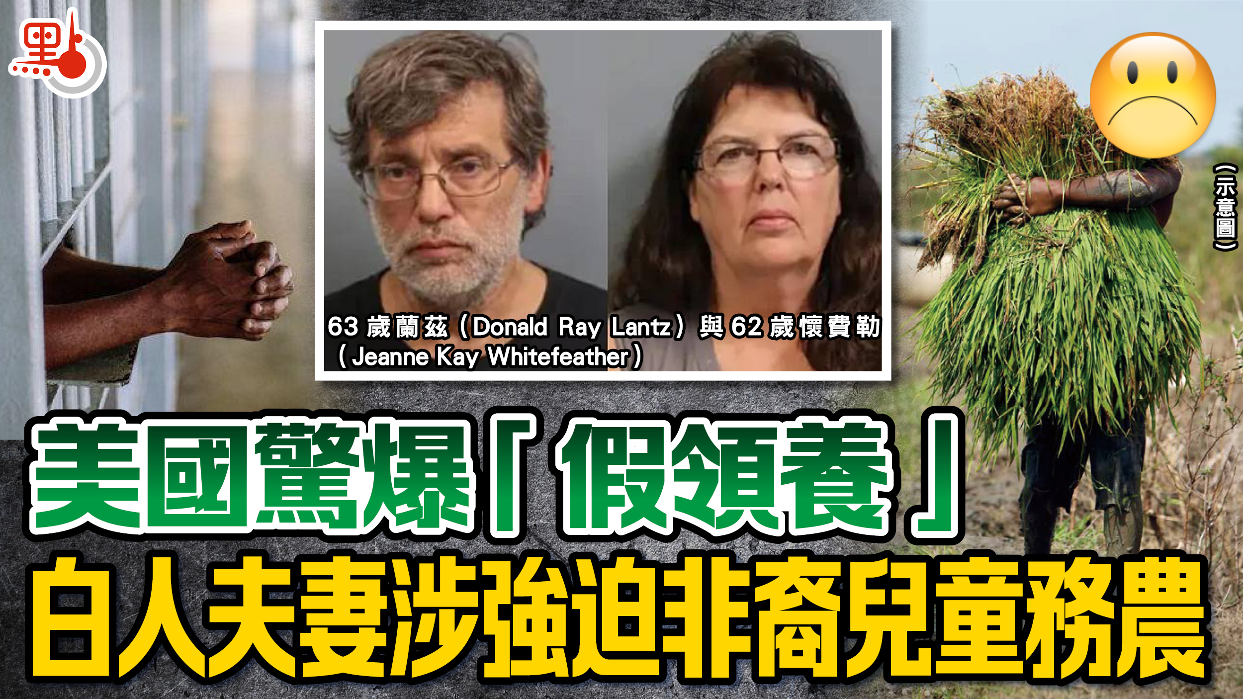 據外電報道,63歲的蘭茲(Donald Ray Lantz)與62歲的懷費勒(Jeanne Kay Whitefeather)被發現專挑非裔種族兒童領養,年齡最小的僅6歲,最大的16歲,並且逼迫他們在農場工作。去年10月,鄰居發現異狀通報社福機構,說看到有兩名青少年身穿破衣,被鎖在穀倉,不被允許進入主屋。社工上門查訪發現他們被囚禁在只有小便盆、沒水沒食物的陰暗穀倉。