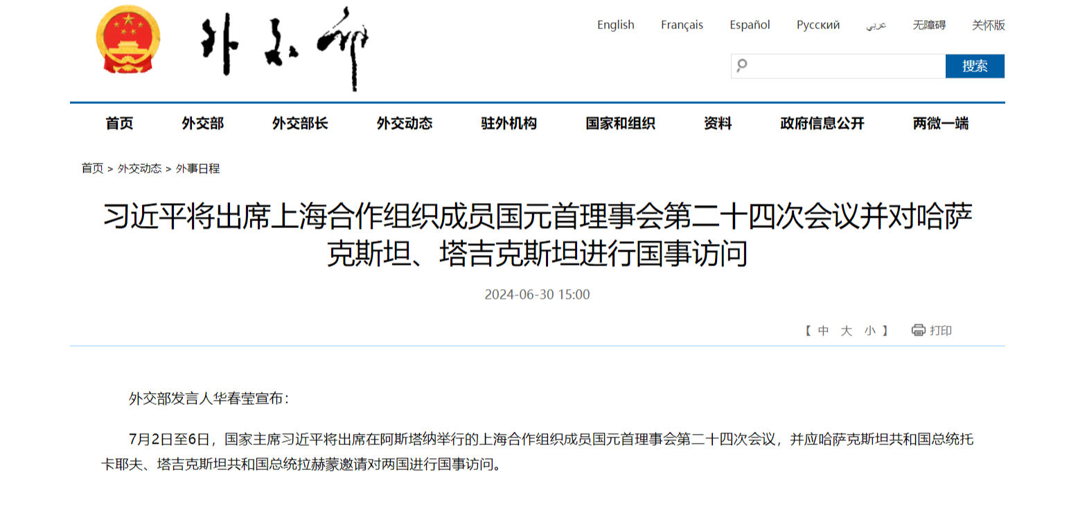 【點新聞報道】外交部發言人華春瑩6月30日宣布:7月2日至6日,國家主席習近平將出席在阿斯塔納舉行的上海合作組織成員國元首理事會第二十四次會議,並應哈薩克斯坦共和國總統托卡耶夫、塔吉克斯坦共和國總統拉赫蒙邀請對兩國進行國事訪問。