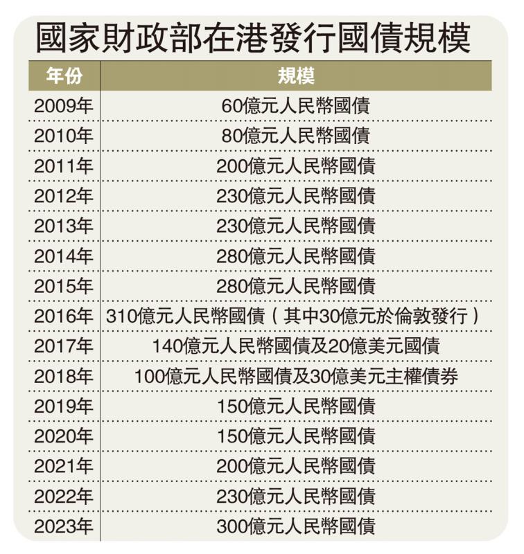 近幾年,中國財政部在港發行的人民幣國債規模持續增加,由當時的150億元增至今年的550億元,已翻多倍。