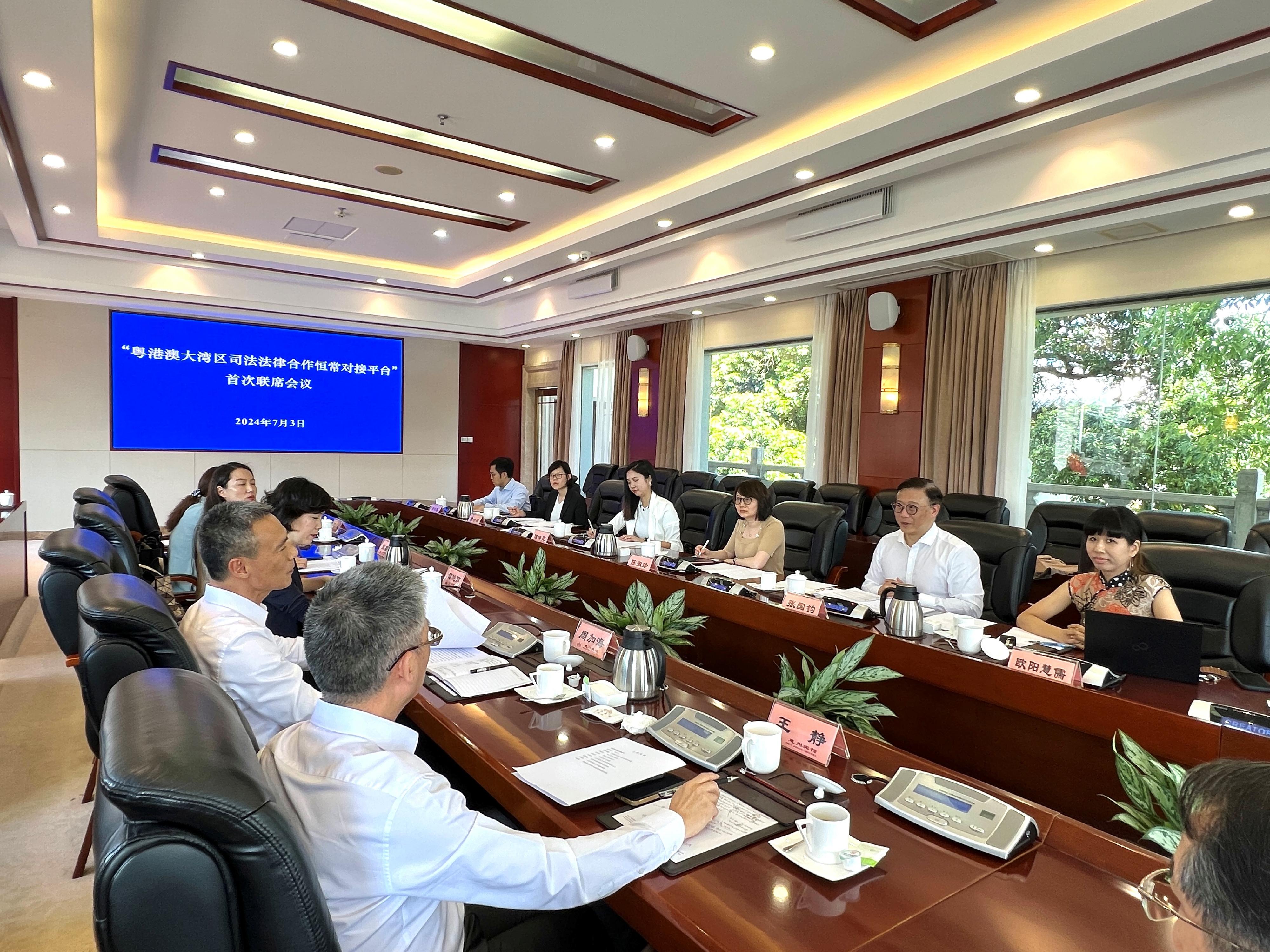 會議由律政司副司長張國鈞與最高人民法院研究室主任周加海共同主持。律政司與最高人民法院於6月中在北京簽署備忘錄,建立粵港澳大灣區司法法律合作恒常對接平台,今日的會議是在平台框架下的首次高層聯席會議。
