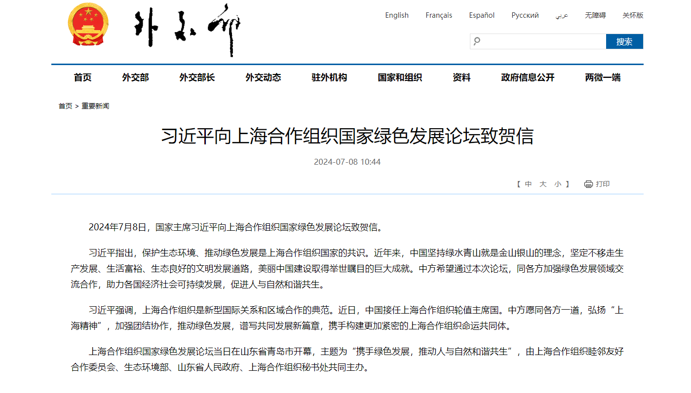 【點新聞報道】據外交部網站消息,今日(8日),國家主席習近平向上海合作組織國家綠色發展論壇致賀信。