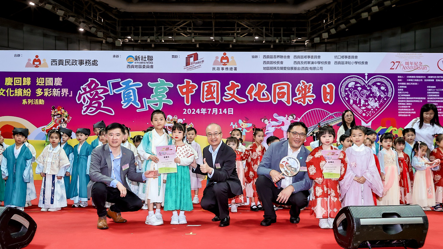 【點新聞報道】由新界社團聯會主辦、西貢民政事務處合辦、新界社團聯會西貢地區委員會承辦的愛「貢」享中國文化同樂日今日(14日)於香港單車館順利舉行。75位幼稚園小朋友和27位小學生化身為「中華文化大使」,身穿傳統華服,獻禮祖國。