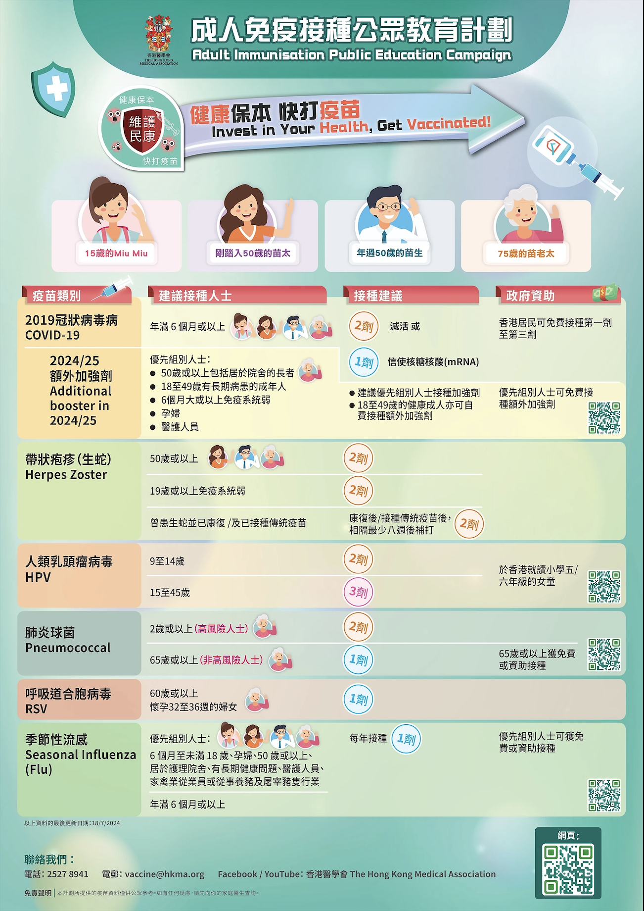 有關的疾病及疫苗資訊包括新冠病毒、季節性流感、肺炎球菌、帶狀疱疹、人類乳頭瘤病毒(HPV)及呼吸道合胞病毒(RSV)六種疫苗,並提出成人免疫接種建議,市民毋須接種所有疫苗,亦可以與家庭醫生商討,視乎本身情況接種合適疫苗。