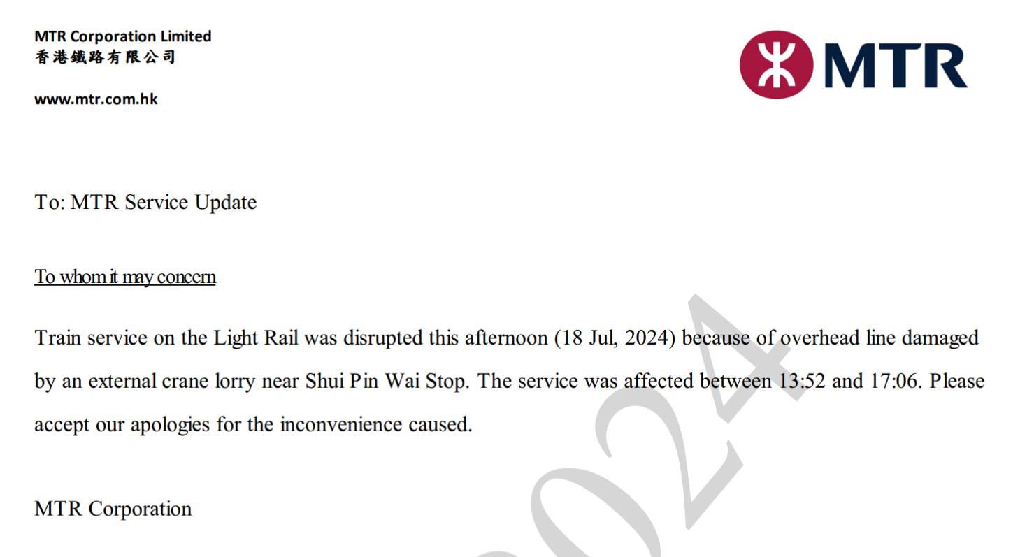 港鐵指,今日下午約1時52分,一輛外來吊臂車駛至水邊圍站附近,其吊臂與架空電纜觸碰,令該處架空電纜損毁,導致輕鐵服務受阻,坑尾村至元朗站的輕鐵服務一度暫停,4條輕鐵線需要改道。經搶修後,相關服務約於下午5時06分恢復。