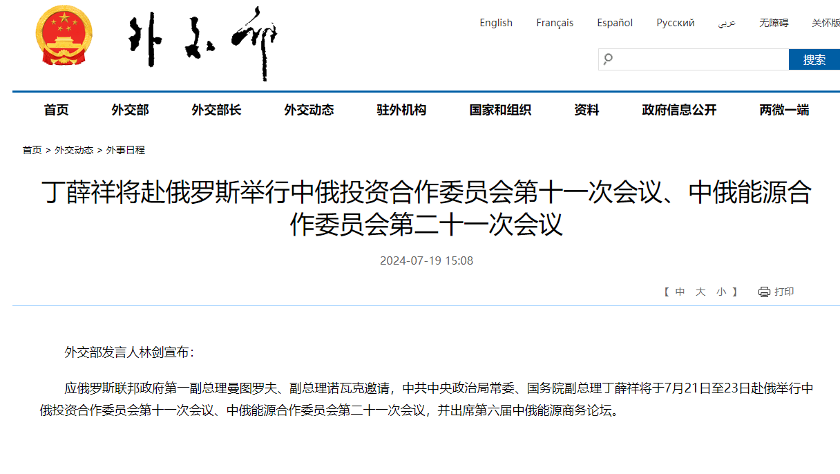 【點新聞報道】外交部發言人林劍今日(19日)宣布:應俄羅斯聯邦政府第一副總理曼圖羅夫、副總理諾瓦克邀請,中共中央政治局常委、國務院副總理丁薛祥將於7月21日至23日赴俄舉行中俄投資合作委員會第十一次會議、中俄能源合作委員會第二十一次會議,並出席第六屆中俄能源商務論壇。