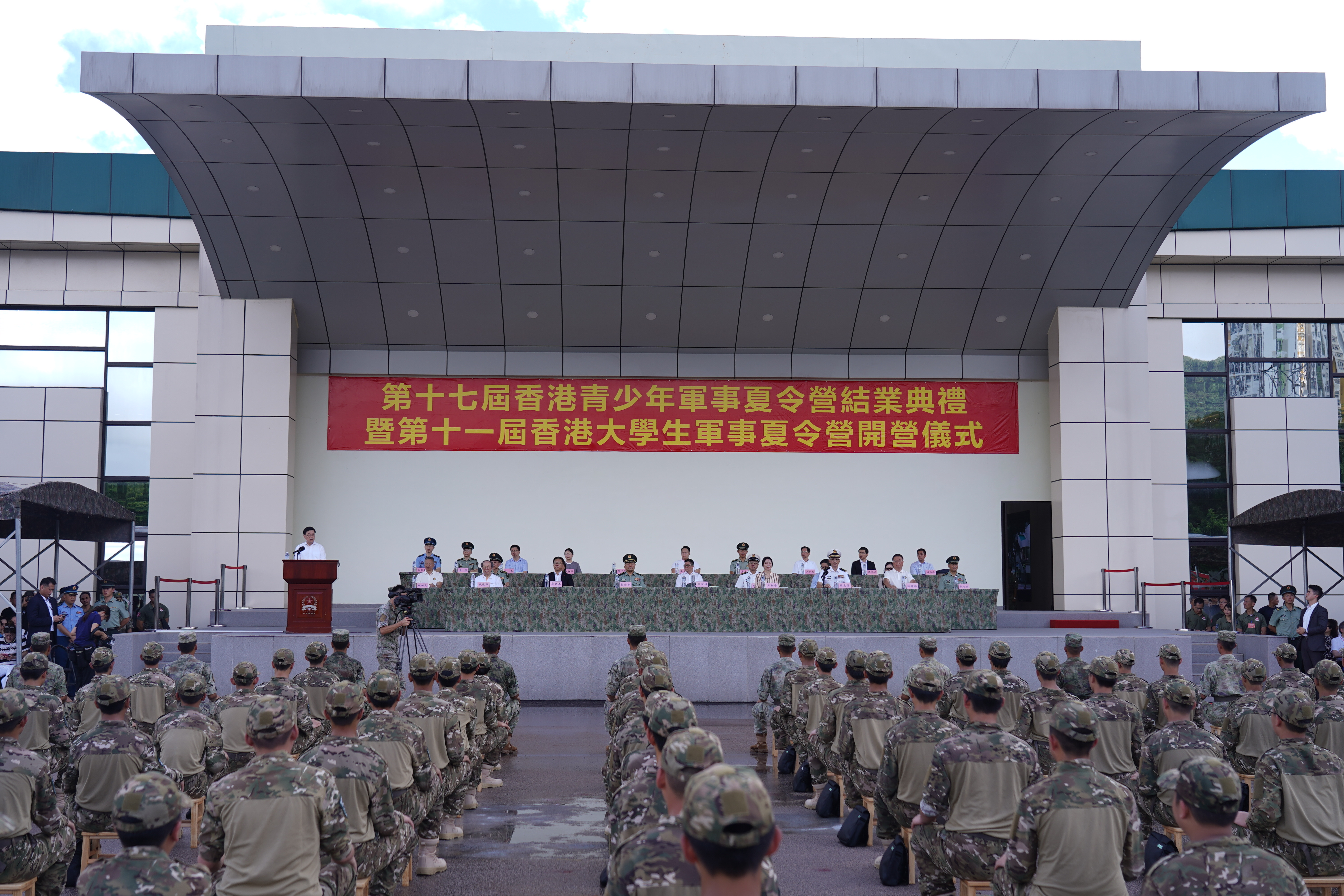 香港特別行政區行政長官李家超、中央人民政府駐香港特別行政區聯絡辦公室副主任盧新寧、外交部駐香港特別行政區特派員公署特派員崔建春、中國人民解放軍駐香港部隊司令員彭京堂等出席結業典禮。各方代表致辭後,嘉賓為學生代表頒發結業證書並合影留念,為本次軍事夏令營畫上了完美的句號。