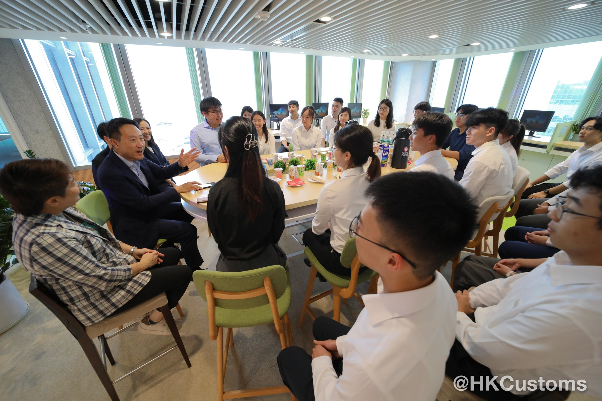 海關表示,六星期的實習期「轉眼就到尾聲」,一班實習生上周四(25日)更有機會去到海關展覽廊參觀,並與海關副關長(管理及策略發展)陳子達(陳Sir)茶聚,互相交流。陳Sir分享了他在大學時期的實習經驗,以及在海關工作的難忘片段。