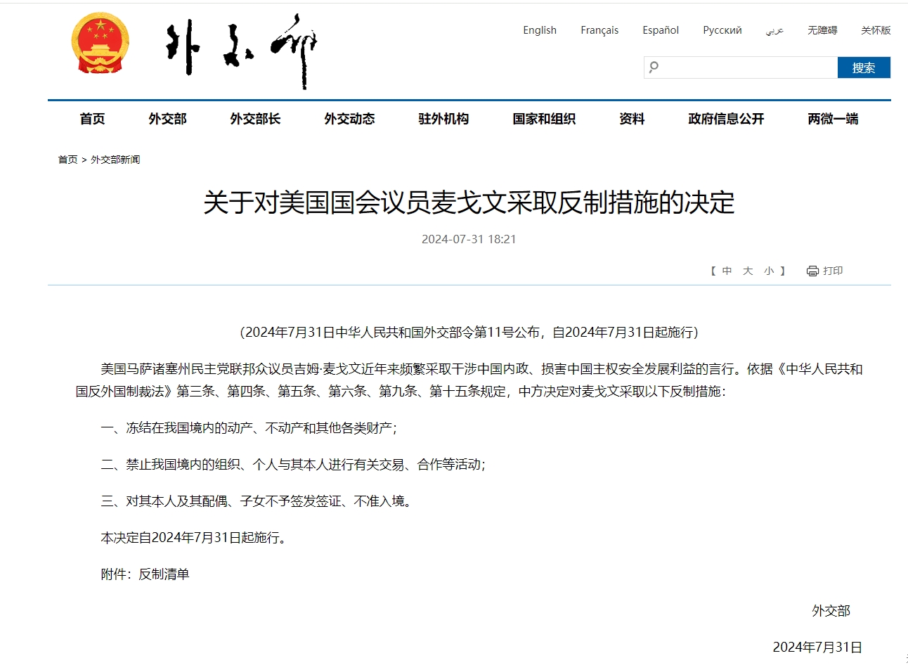 【點新聞報道】外交部網站今日(31日)公告,美國馬薩諸塞州民主黨聯邦眾議員吉姆·麥戈文近年來頻繁採取干涉中國內政、損害中國主權安全發展利益的言行。依據《中華人民共和國反外國制裁法》第三條、第四條、第五條、第六條、第九條、第十五條規定,中方決定對麥戈文採取以下反制措施: