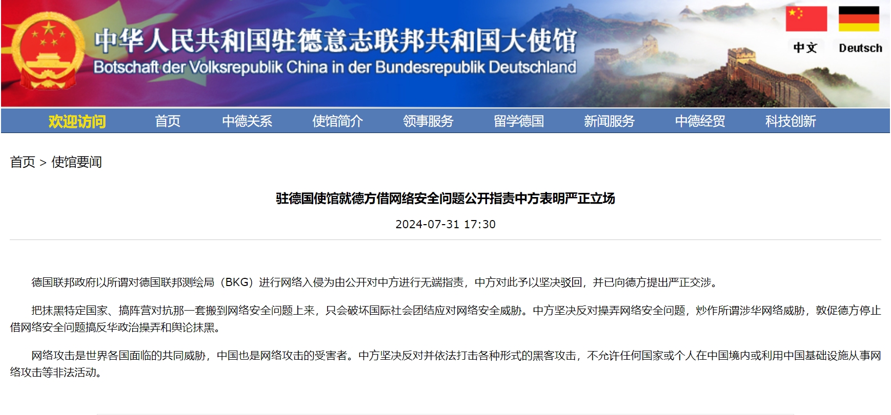 【點新聞報道】據中國駐德國大使館網站消息,7月31日,中國駐德國使館就德方借網絡安全問題公開指責中方表明嚴正立場。