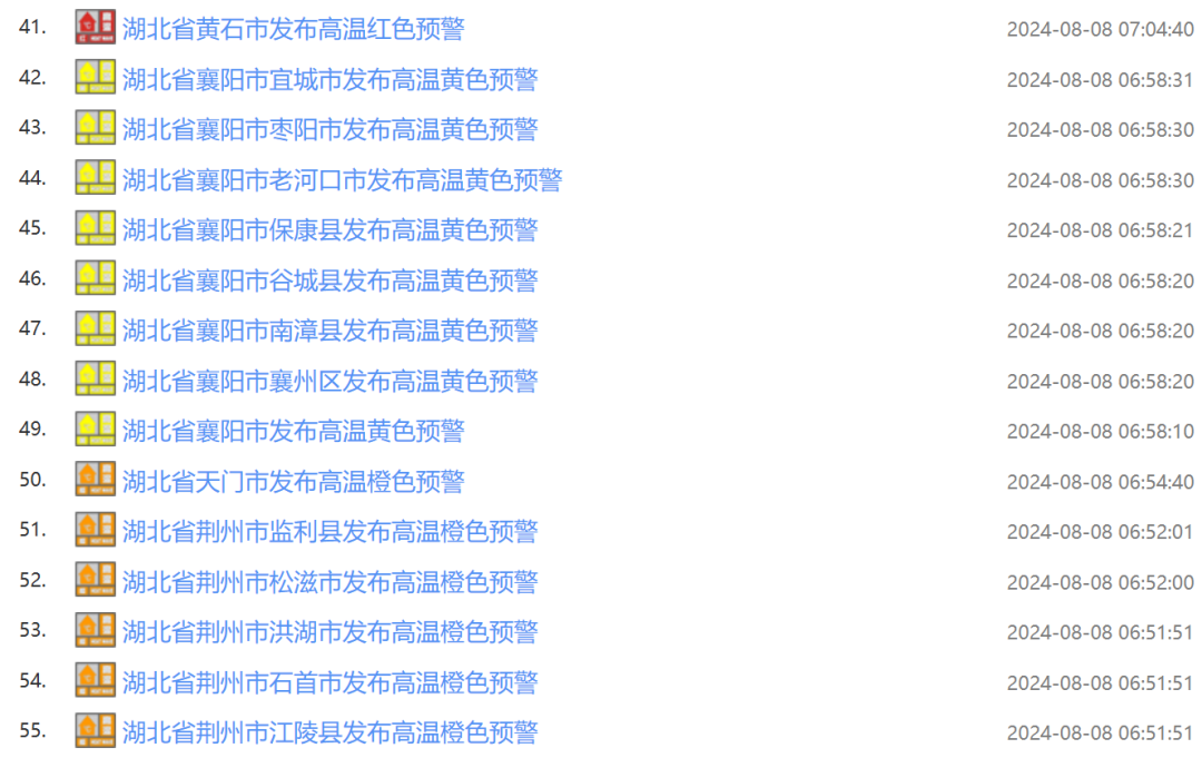 湖北省面積為18.6萬平方公里、共103個縣級區劃,74條高溫預警信息意味着,該省七成縣市區、超過10萬平方公里的面積上,出現35℃以上的高溫,超過半數的區域最高氣溫在37℃以上,宜昌、孝感南部、武漢、鄂州、黃石、黃岡、咸寧等地181個鄉鎮最高氣溫突破了40℃,個別地方如黃岡市浠水縣甚至上探42℃。