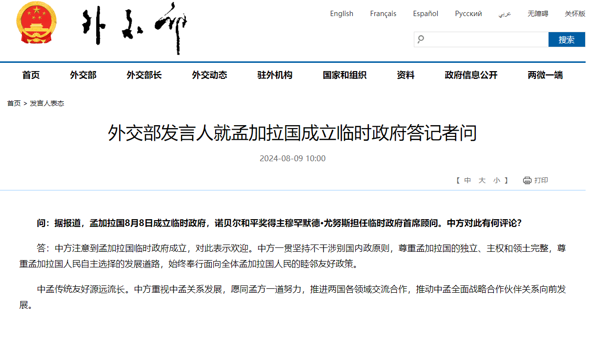 外交部發言人表示,中方注意到孟加拉國臨時政府成立,對此表示歡迎。中方一貫堅持不干涉別國內政原則,尊重孟加拉國的獨立、主權和領土完整,尊重孟加拉國人民自主選擇的發展道路,始終奉行面向全體孟加拉國人民的睦鄰友好政策。