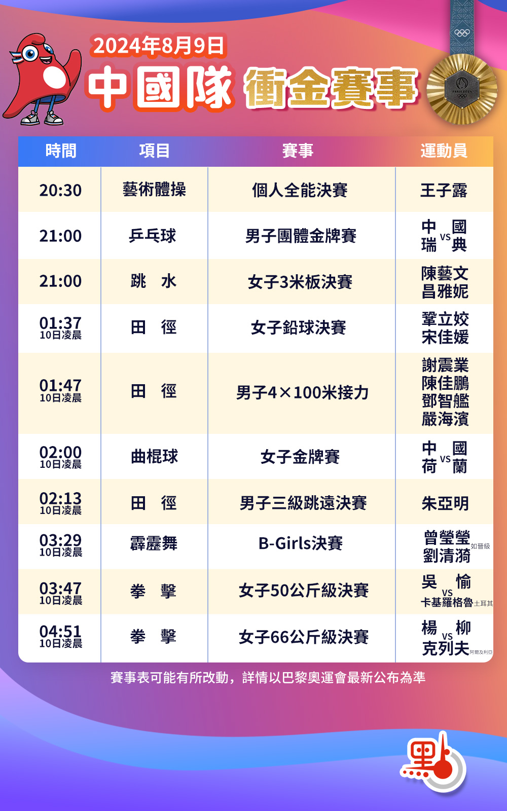 巴黎奧運|9日國家隊焦點賽事/衝金賽事(精簡版)