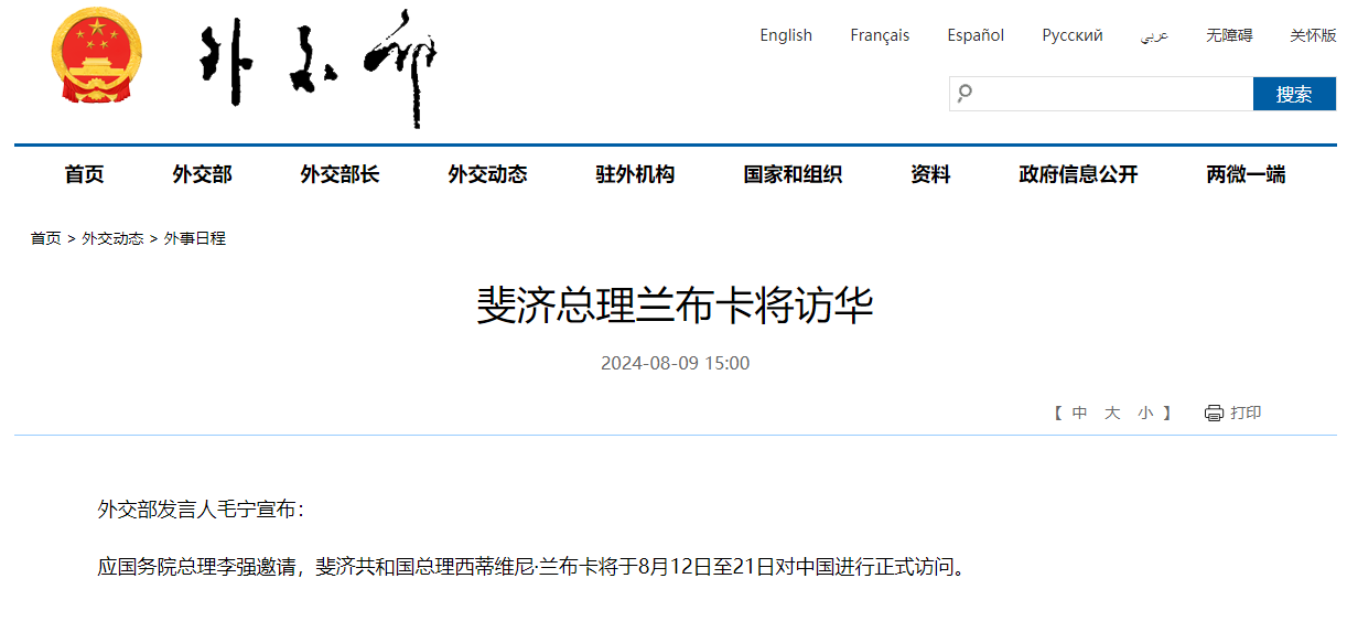【點新聞報道】據外交部網站今日(9日)消息,外交部發言人毛寧宣布,應國務院總理李強邀請,斐濟共和國總理西蒂維尼·蘭布卡將於8月12日至21日對中國進行正式訪問。
