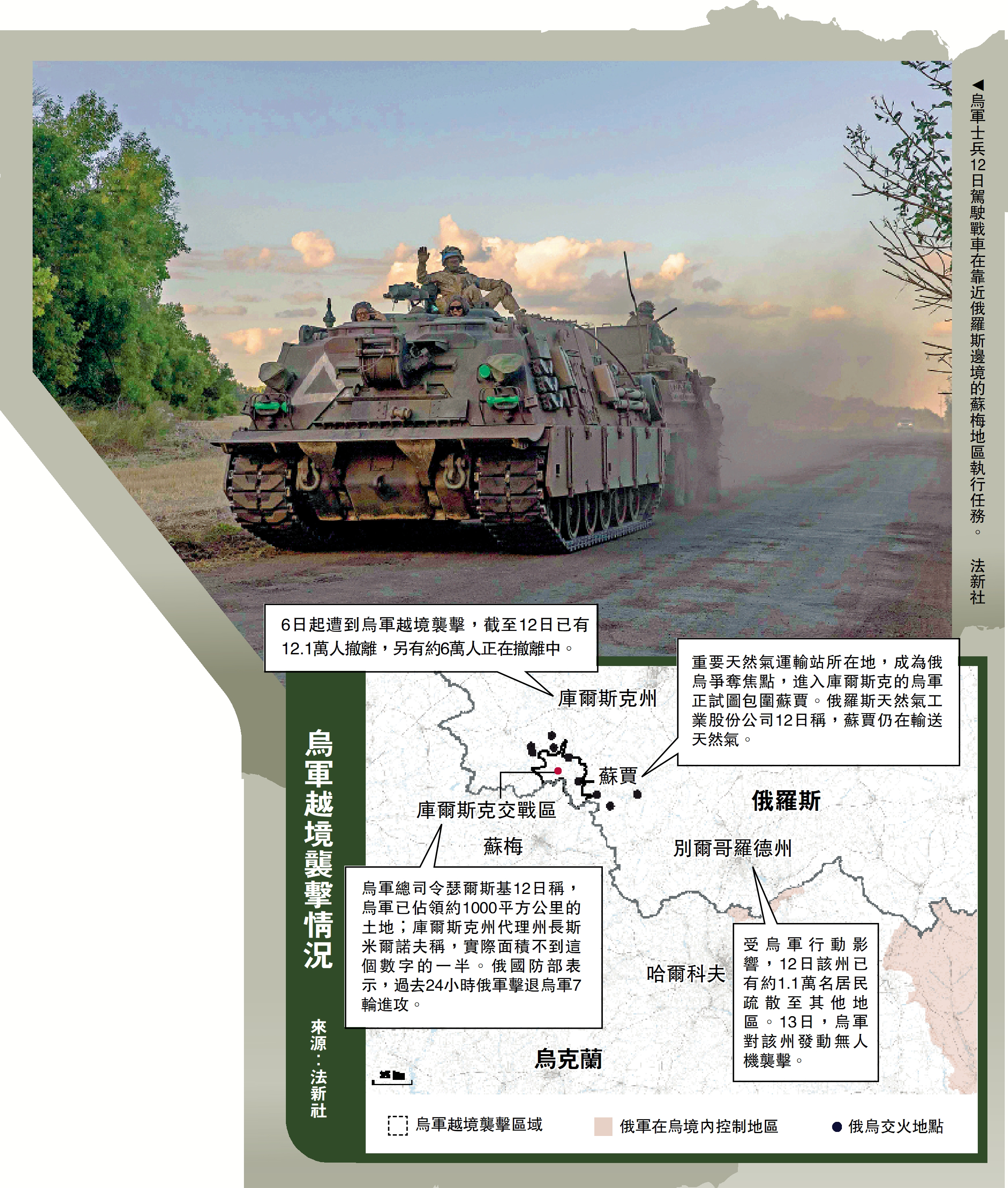 大公報綜合報道,烏軍總司令瑟爾斯基12日稱,烏軍越境進攻俄羅斯庫爾斯克州一周以來,已控制約1000平方公里的領土。俄方承認有領土損失,但面積不到烏方聲稱的一半。有分析稱,烏克蘭此時襲擊俄羅斯本土,是為了在美國大選前傳遞「烏克蘭人還能打」的信號,向美方索要更多軍援。烏總統澤連斯基12日在基輔與美國參議院代表團會晤,討論烏軍使用西方援助遠程武器的問題。