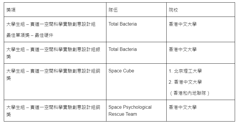 大賽評委團由國內外航天領域的權威專家組成,根據項目的科學性、創新性、實用性和可行性等多方面因素進行綜合評價。中大隊伍在比賽中獲得驕人成績,所獲獎項如下: