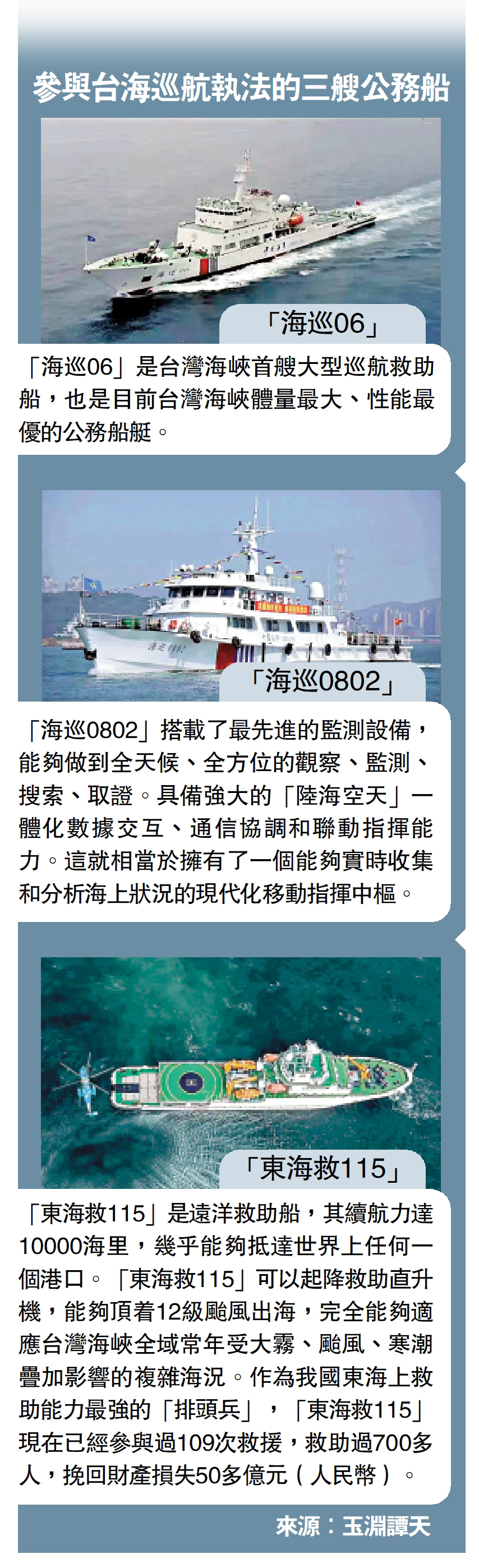 中央廣播電視總台旗下的新媒體賬號「玉淵譚天」19日發表文章指出,8月17日至18日,交通運輸部所屬福建海事局、東海救助局共同實施2024年台灣海峽海上巡航執法行動。執行這次任務的三艘公務船,分別是「海巡06」「海巡0802」「東海救115」。從船隻配備可以發現,不管是監管執法,還是應急救援,海事部門在台灣海峽都已經完全具備了全面管理的硬實力。