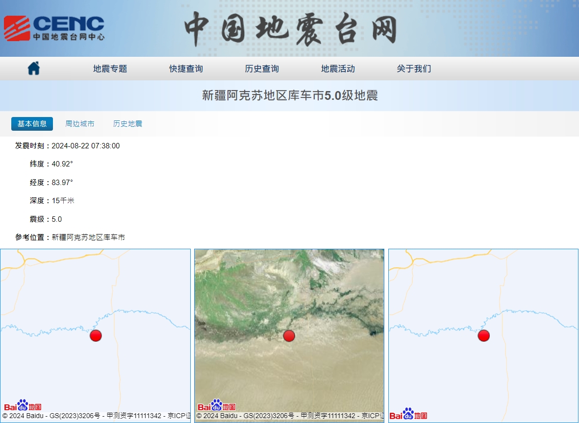 【點新聞報道】中國地震台網正式測定,今日(22日)7時38分,在新疆阿克蘇地區庫車市(北緯40.92度,東經83.97度)發生5.0級地震,震源深度15千米。