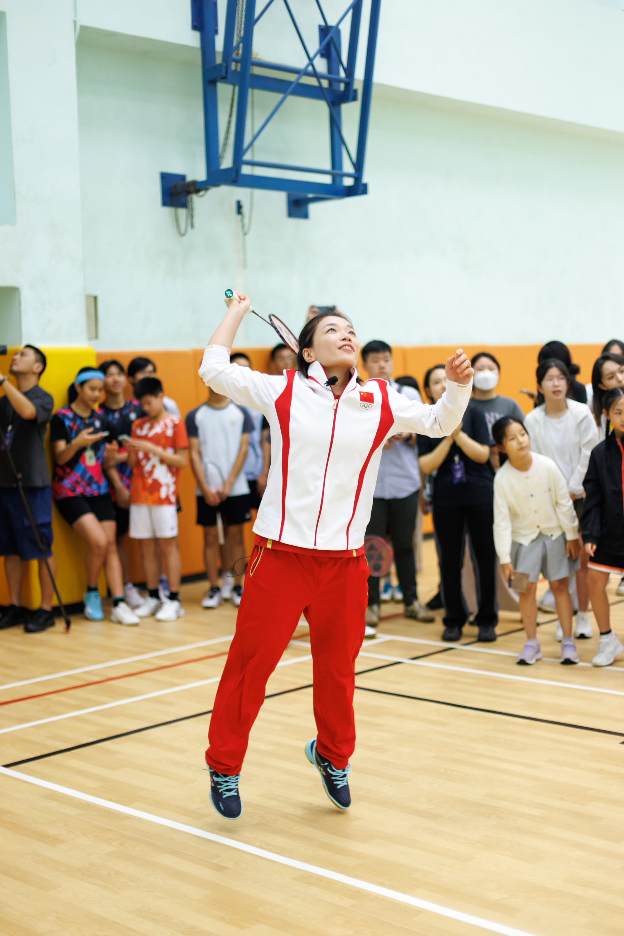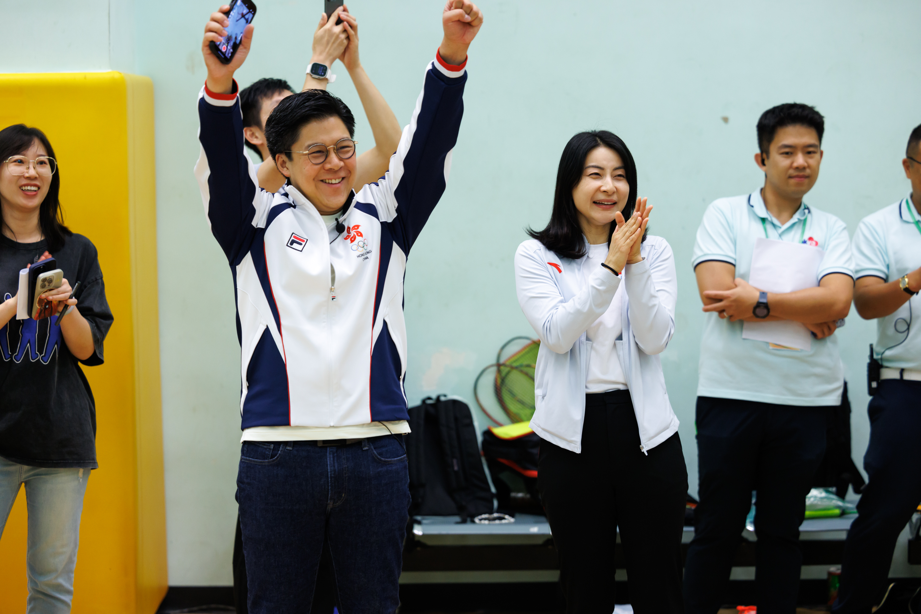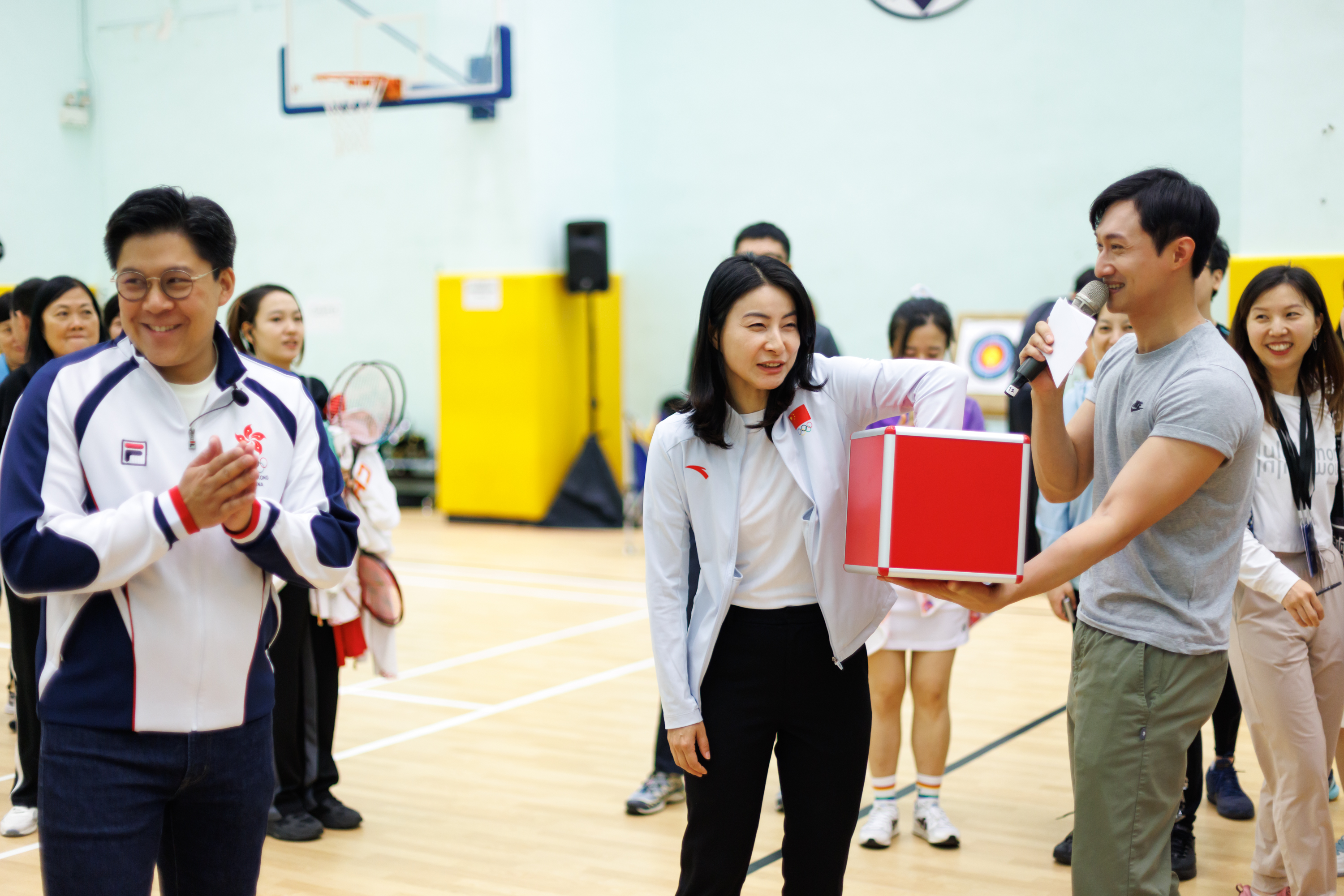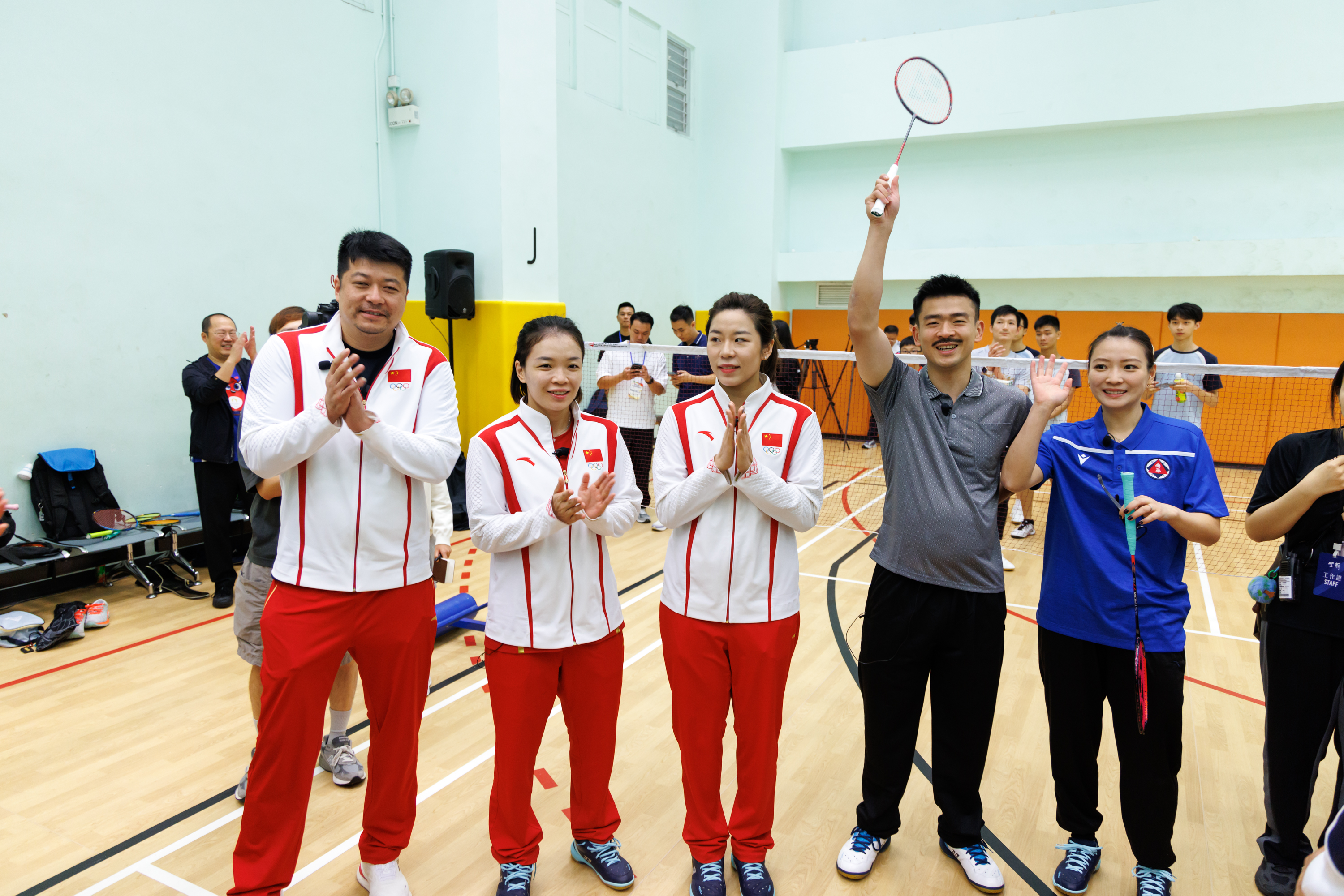 驚喜不止於此。霍啟剛介紹到,今天來到現場的除了「雅思」組合,還有在巴黎奧運會上奪得女子雙打冠軍的「凡塵」組合陳清晨/賈一凡,及國家羽毛球隊教練員陶嘉明。隨後,「雅思」組合、「凡塵」組合及教練陶嘉明與在場市民進行了羽毛球「十環」挑戰和羽毛球底線入筐挑戰的趣味遊戲,場館內熱情洋溢,充滿歡聲笑語。