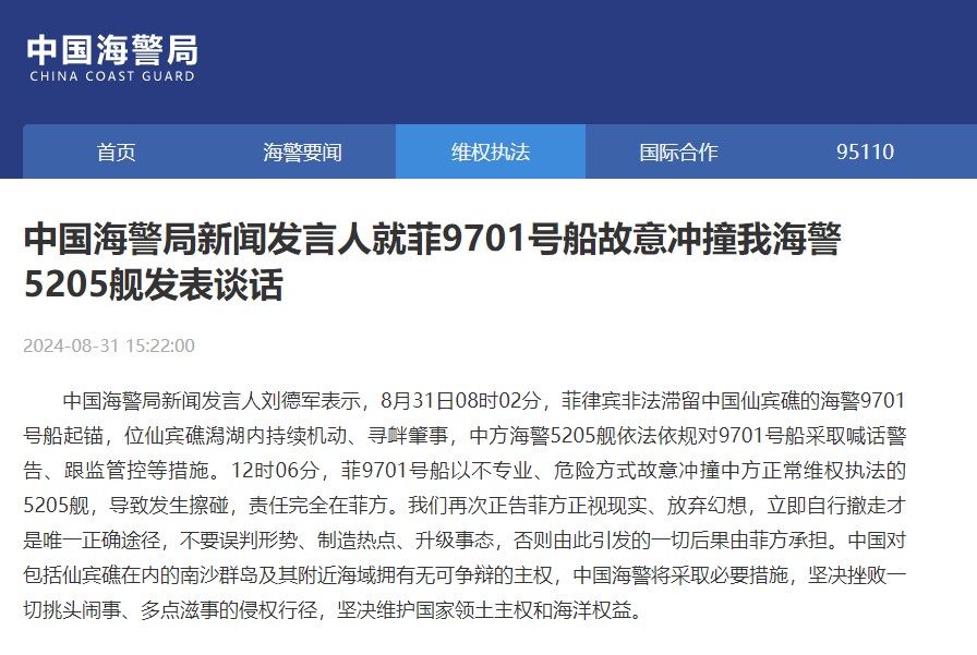 【點新聞報道】中國海警局新聞發言人劉德軍表示,8月31日08時02分,菲律賓非法滯留中國仙賓礁的海警9701號船起錨,位仙賓礁潟湖內持續機動、尋釁肇事,中方海警5205艦依法依規對9701號船採取喊話警告、跟監管控等措施。12時06分,菲9701號船以不專業、危險方式故意衝撞中方正常維權執法的5205艦,導致發生擦碰,責任完全在菲方。