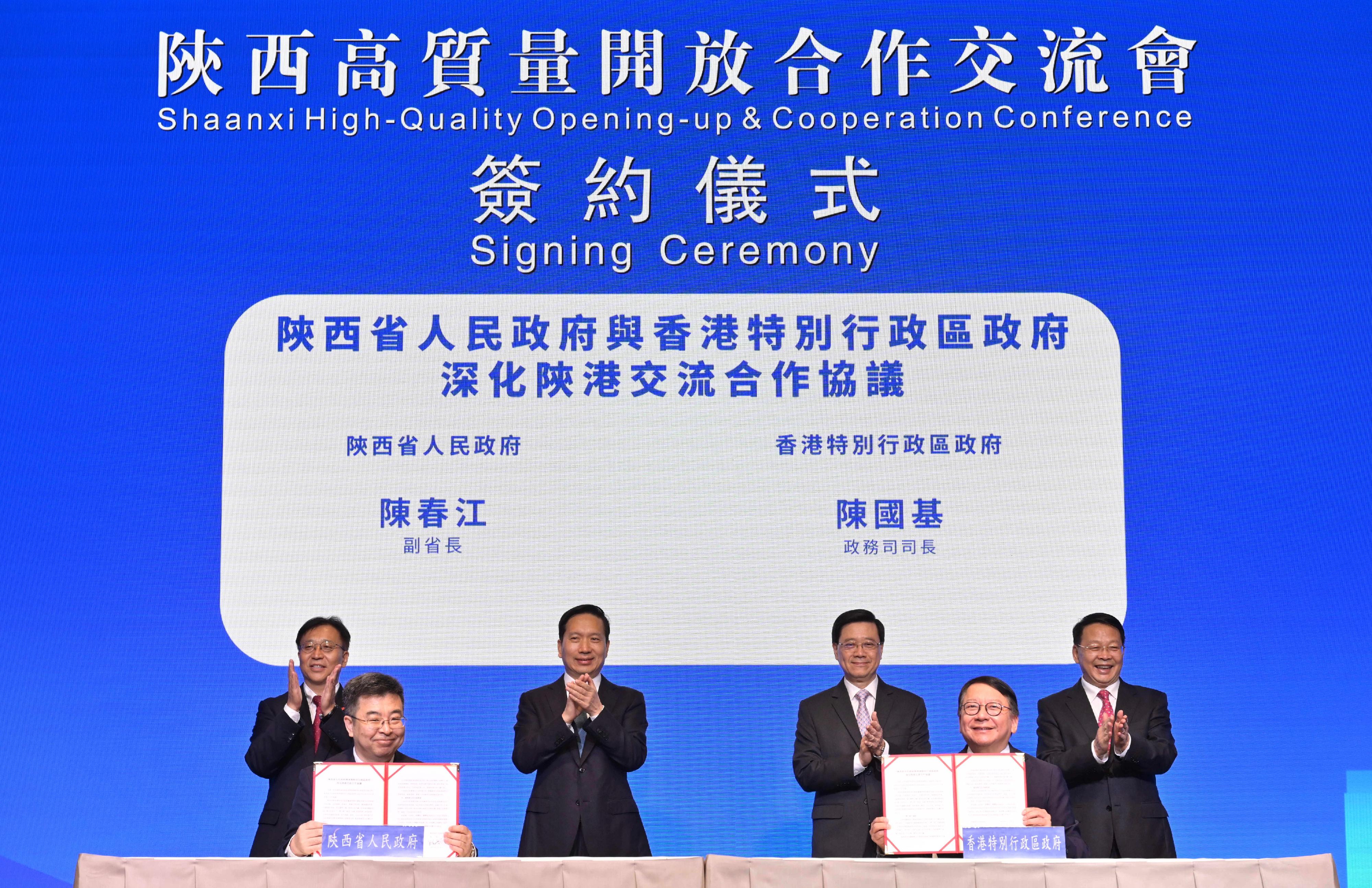 【點新聞報道】行政長官李家超今日(4日)出席在香港舉行的陝西高質量開放合作交流會,並在會上和陝西省委書記趙一德共同見證政務司司長陳國基與陝西省人民政府副省長陳春江簽署《深化陝港交流合作協議》。