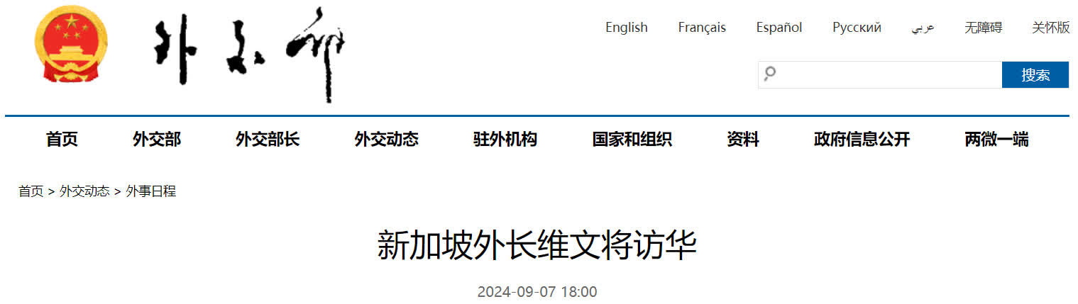 【點新聞報道】據外交部網站今日(7日)消息,外交部發言人毛寧宣布,應中共中央政治局委員、外交部長王毅邀請,新加坡外長維文將於9月8日至9日對中國進行正式訪問。