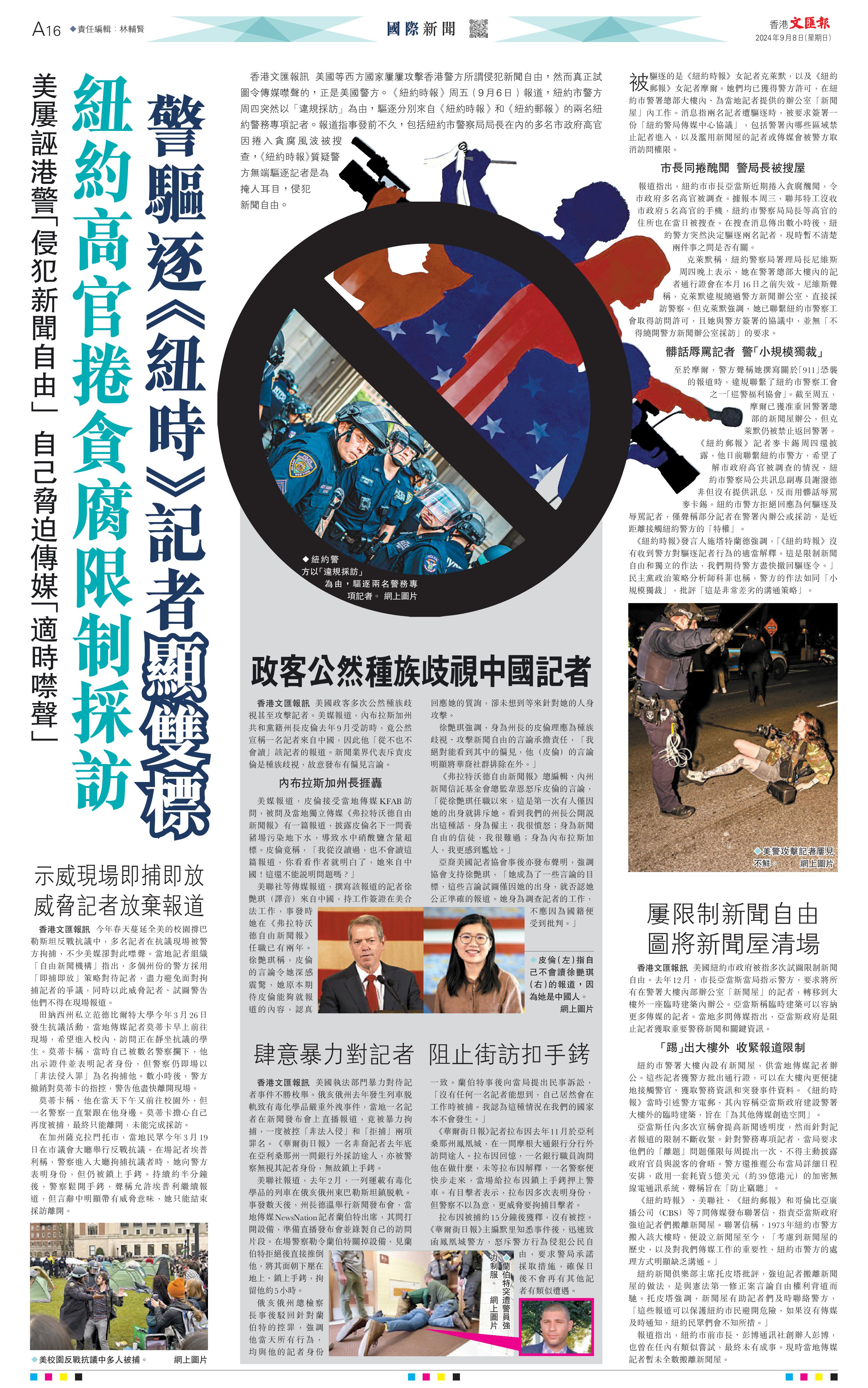美國等西方國家屢屢攻擊香港警方所謂侵犯新聞自由,然而真正試圖令傳媒噤聲的,正是美國警方。《紐約時報》周五(9月6日)報道,紐約市警方周四突然以「違規採訪」為由,驅逐分別來自《紐約時報》和《紐約郵報》的兩名紐約警務專項記者。報道指事發前不久,包括紐約市警察局局長在內的多名市政府高官因捲入貪腐風波被搜查,《紐約時報》質疑警方無端驅逐記者是為掩人耳目,侵犯新聞自由。
