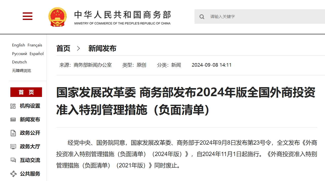 【點新聞報道】商務部網站消息,經黨中央、國務院同意,國家發展改革委、商務部於2024年9月8日發布第23號令,全文發布《外商投資准入特別管理措施(負面清單)(2024年版)》,自2024年11月1日起施行。國家發展改革委有關負責人士接受採訪時指出,本次負面清單修訂後,我國製造業領域外資准入限制措施實現「清零」,高水平對外開放取得了新進展。