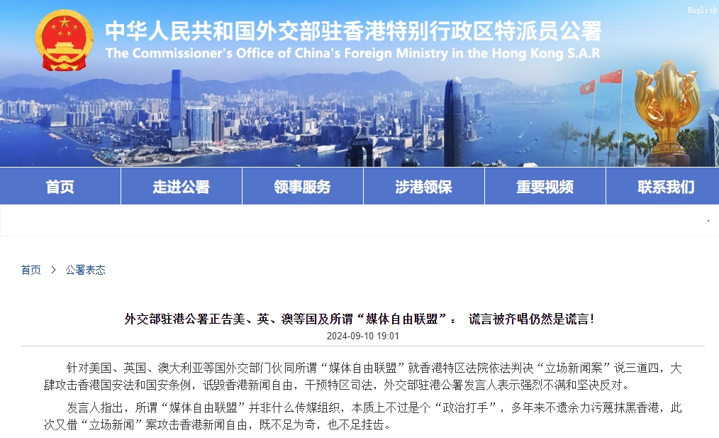 【點新聞報道】針對美國、英國、澳大利亞等國外交部門夥同所謂「媒體自由聯盟」就香港特區法院依法判決「立場新聞案」說三道四,大肆攻擊香港國安法和國安條例,詆毀香港新聞自由,干預特區司法,外交部駐港公署發言人今日(10日)表示強烈不滿和堅決反對。