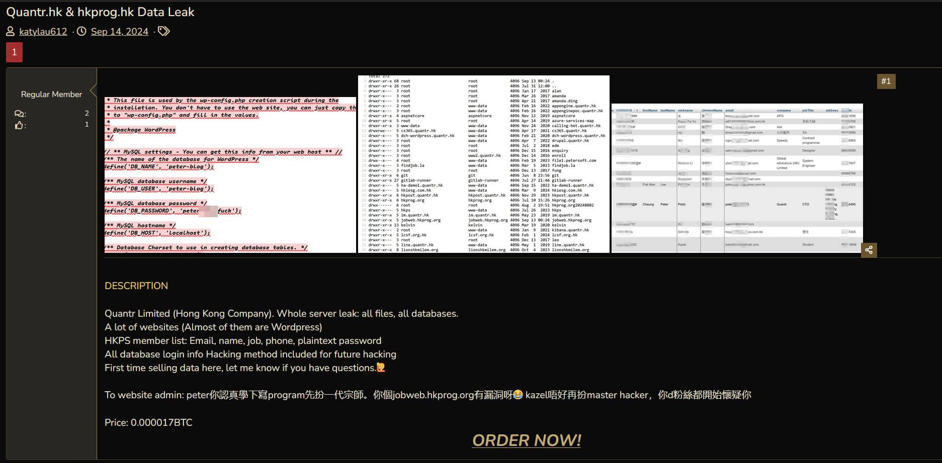 【點新聞報道】香港編程學會系統今日(14日)於社交平台發文指遭黑客入侵,懷疑有會員及Quantr Limited資料被人在暗網發售。黑客報稱已取得學會會員的個人資料,包括姓名、電話號碼、電郵地址、職業和賬戶密碼,並以比特幣出售。學會網站暫時未能顯示頁面。