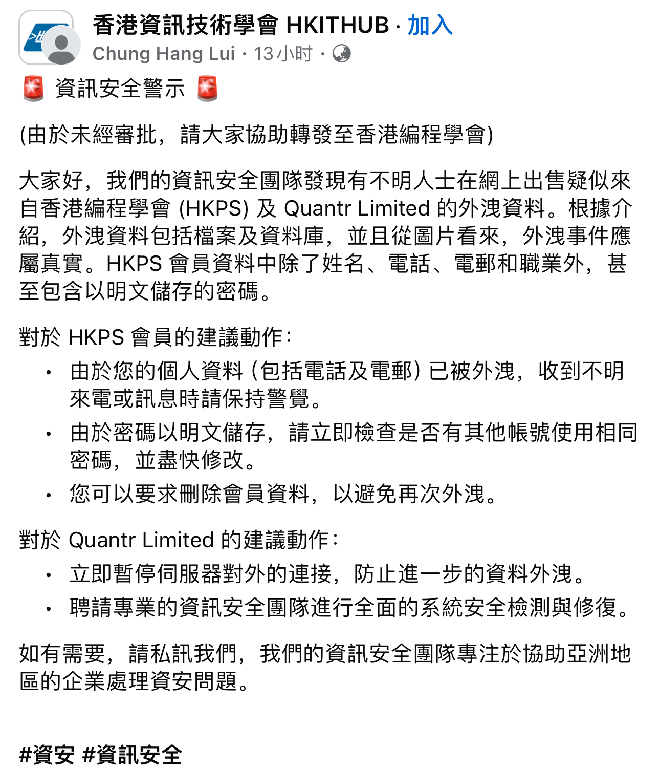 據傳媒報道,電腦安全研究員賴灼東表示,黑客公開的部分資料屬於他認識的人,相信學會系統已被入侵。他又指,學會以純文字的方式儲存密碼,在保障資料安全上做得差勁,應該加密處理,令黑客無法輕易取得原始密碼。他又指,網絡應用框架如沒有更新,很容易出現漏洞,令黑客容易繞過登入程序,執行惡意程式,盜取資料。他認為,編程人員理應將數據安全納入設計和開發過程,而不應在系統完成後才考慮安全性。