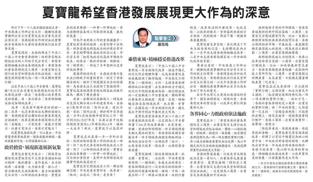 這是中共二十屆三中全會後,夏寶龍繼7月23日在京會見香港特區財政司司長陳茂波時,提出「香港應以改革實現更好發展」後,再次提出「香港積極穩妥推進各領域改革」。