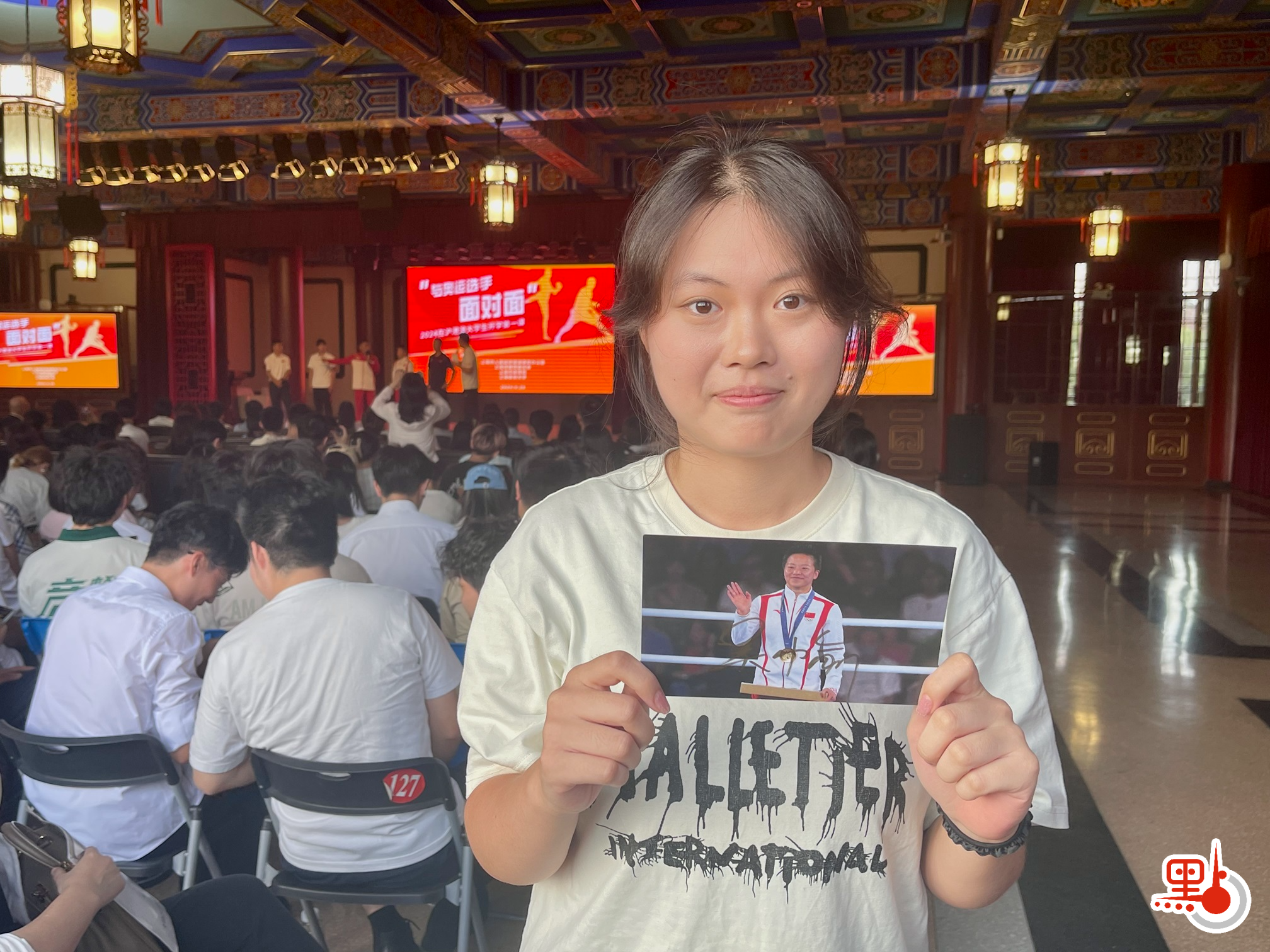 來自上海中醫藥大學的大一新生高慧清有幸上台接受了吳愉的指點,還意外獲贈了吳愉的簽名照,這讓她下台後也久久難以平復激動的心情。「當時聽說港澳學生有這樣一個與奧運冠軍面對面的機會就趕緊報名了。我有看過她在巴黎的比賽,當時覺得她真的很有力量感,那種女性的力量,非常強大,很帥。今天不僅見到她了,還上台和她進行了互動,很開心。現場見到她和看比賽畫面還是不一樣的,現場看到她感覺會比電視畫面賽場上的她多了一絲溫柔。」