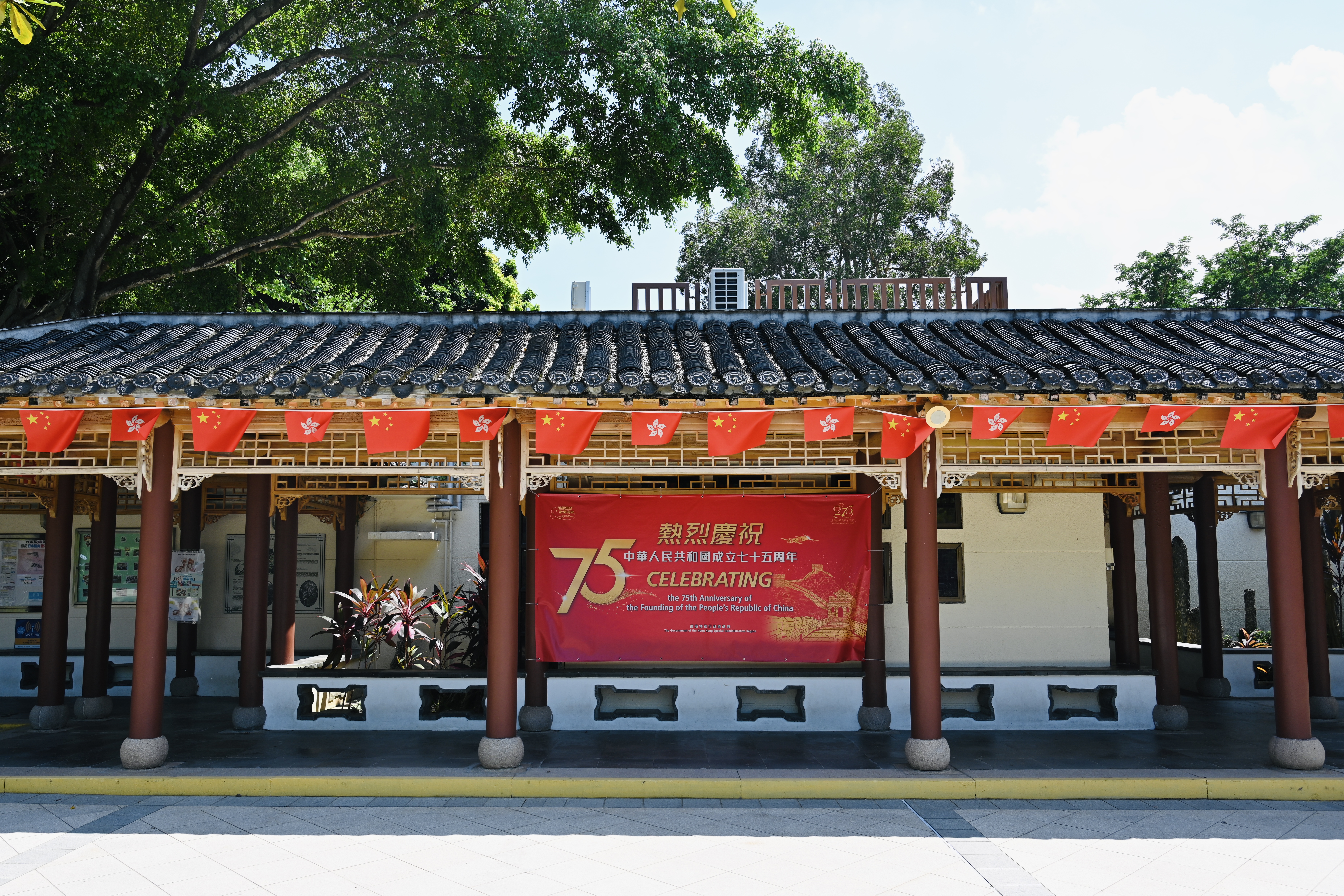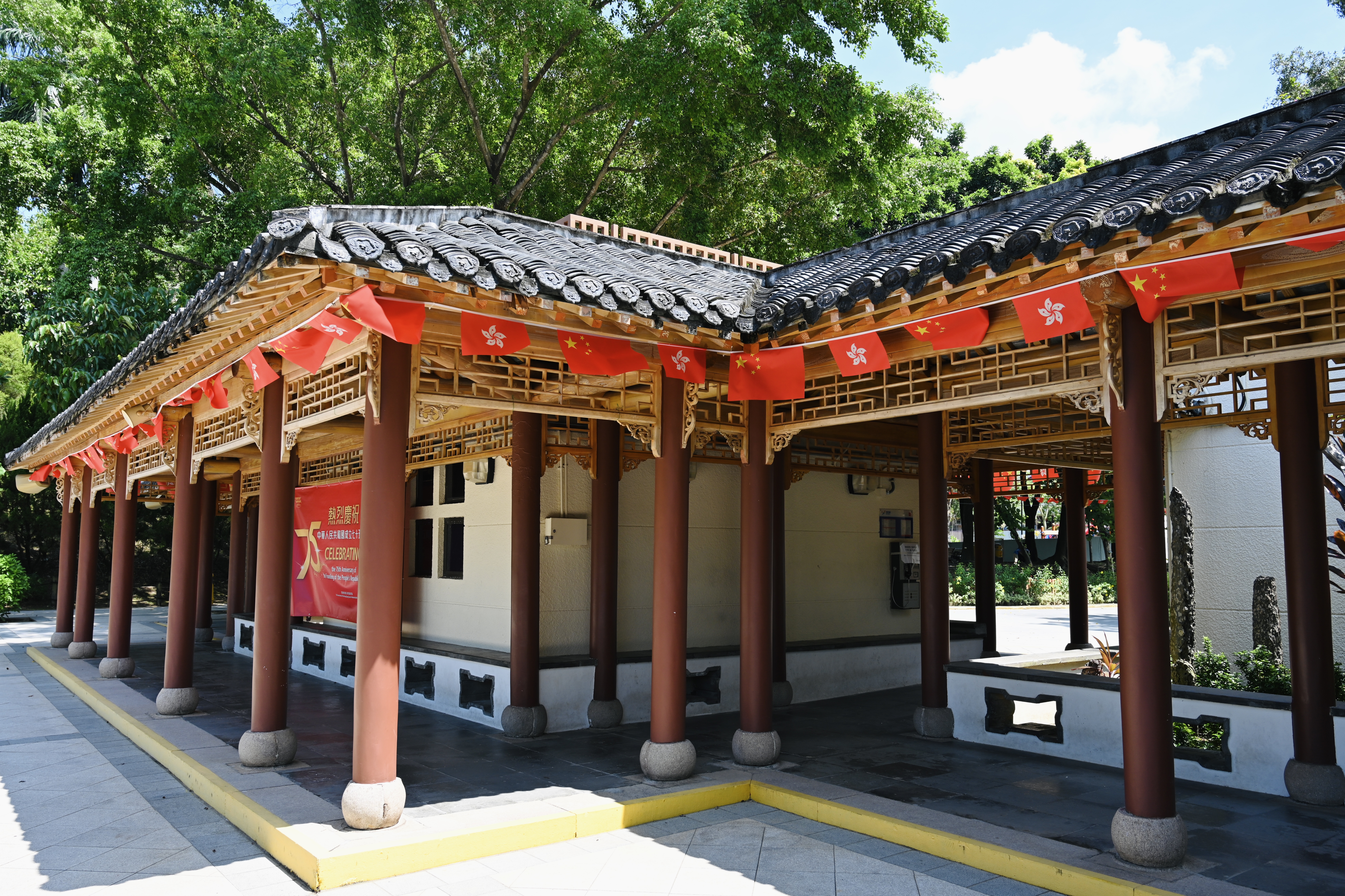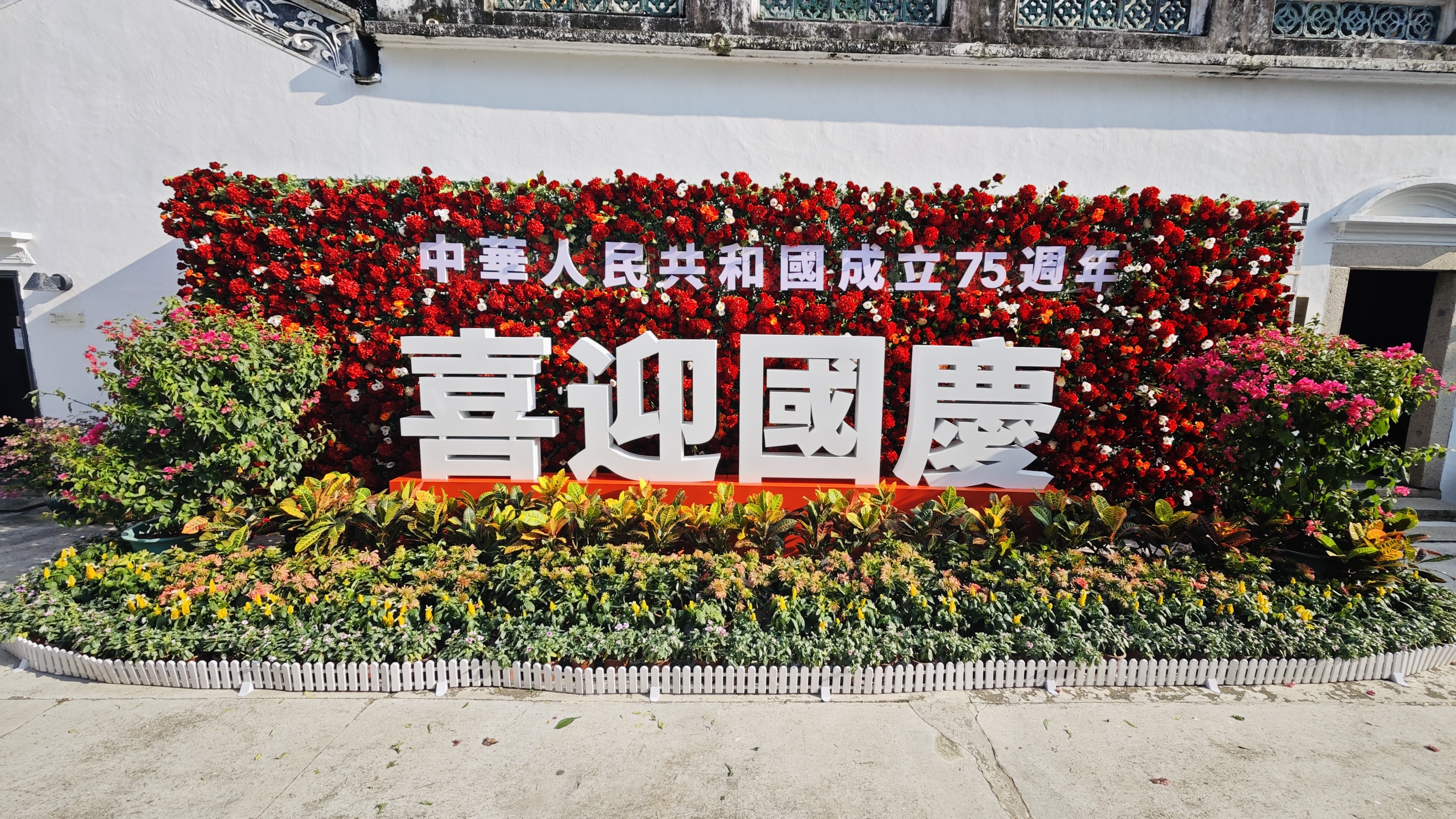 在香港天水圍公園、北區公園,澳門大三巴、鄭家大屋等文旅休閒熱門地,中海物業增設了帶有國慶元素的花藝布置和大型展板;在香港北區運動場、屯門大會堂、元朗劇院、沙田大會堂、灣仔海濱長廊等室外廣場與海濱走廊上,中海物業亦均掛起國旗、貼起橫幅。秋日艷陽下,一抹抹「中國紅」格外艷麗,吸引市民遊人駐足觀賞、打卡。