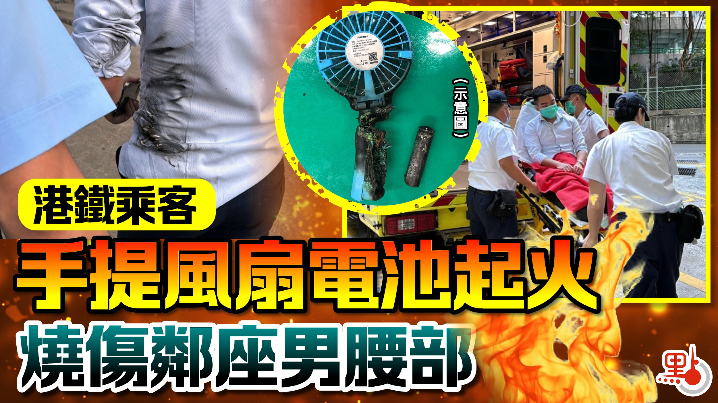 昨日上午9時許,26歲事主乘搭港鐵將軍澳線往北角,當列車駛至油塘站時,有乘客的手提風扇鋰電池突然冒煙起火,事主閃避不及腰部被燒傷,恤衫近左邊腰間及手臂位置燒穿熏黑,由接報到場救護車送往聯合醫院治理。
