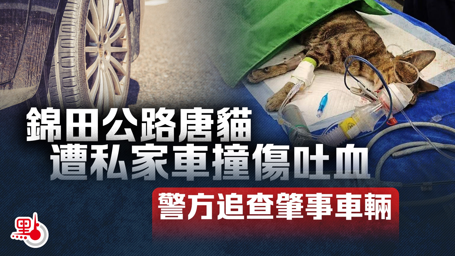 【點新聞報道】警方昨日(9日)晚11時59分接獲報案,指八鄉錦田公路有一隻雌性唐貓疑被私家車撞傷。唐貓口鼻吐血大腿受傷,重創倒在馬路,私家車不顧而去。有熱心司機通知「毛守救援」,將受傷貓咪送往動物診所搶救。