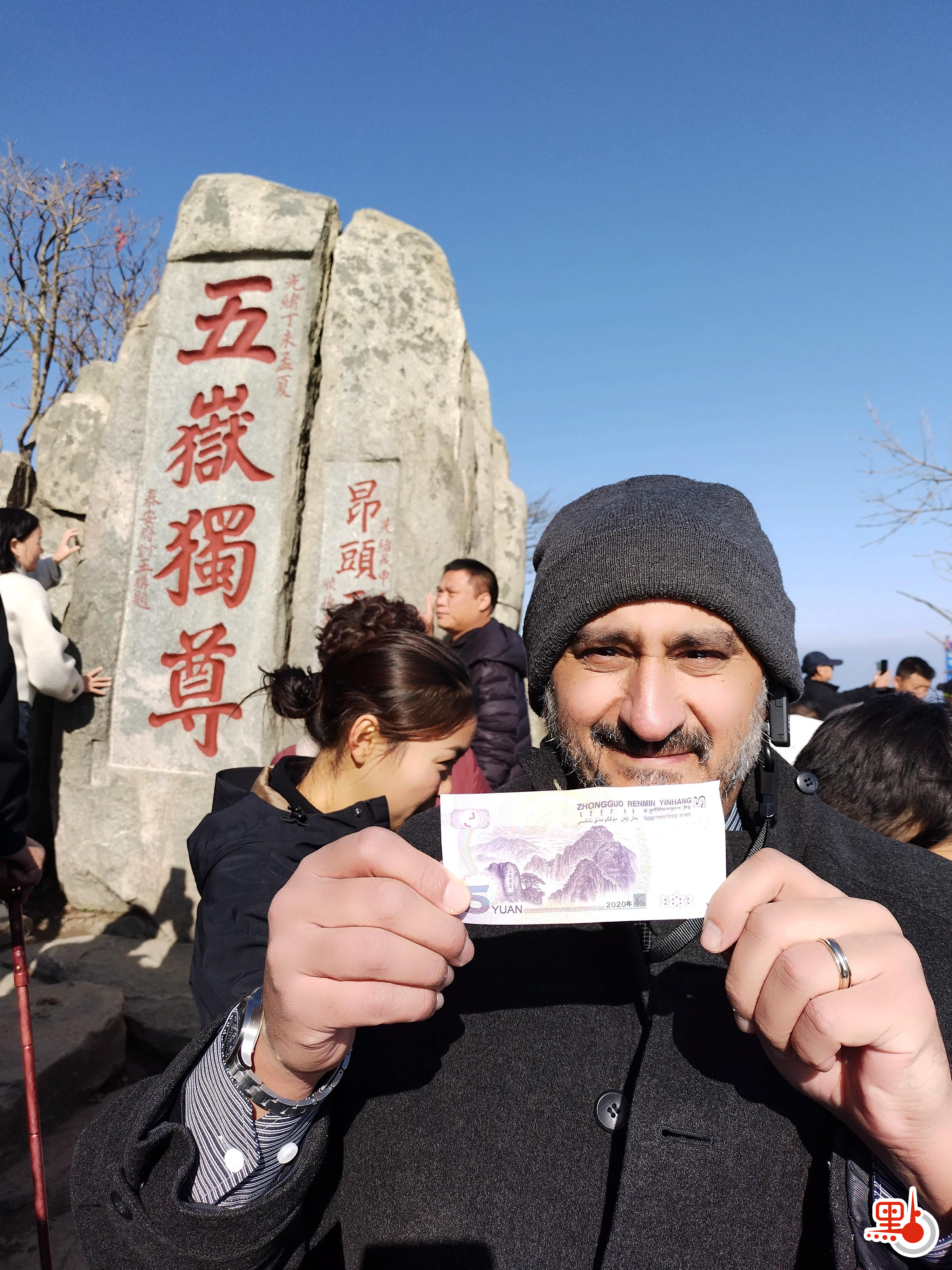 泰山是世界文化與自然的雙重遺產,因其氣勢之磅礴為五嶽之首,故又有「天下名山第一」的美譽。自古以來,中國人就崇拜泰山,有「泰山安,四海皆安」的說法。第五套人民幣5元紙幣的背面圖案是泰山,泰山上的「五嶽獨尊」石刻也成為最火爆的打卡點,許多遊客手持5元人民幣紙鈔在此拍照打卡留念。阿聯酋駐港總領館經濟分析師尹翰墨(Ahmed Elbeshlawy)自天街一路拾階上行,至山頂「五嶽獨尊」石刻,他也拿出5元人民幣紙鈔,留下了一張有紀念意義的照片。