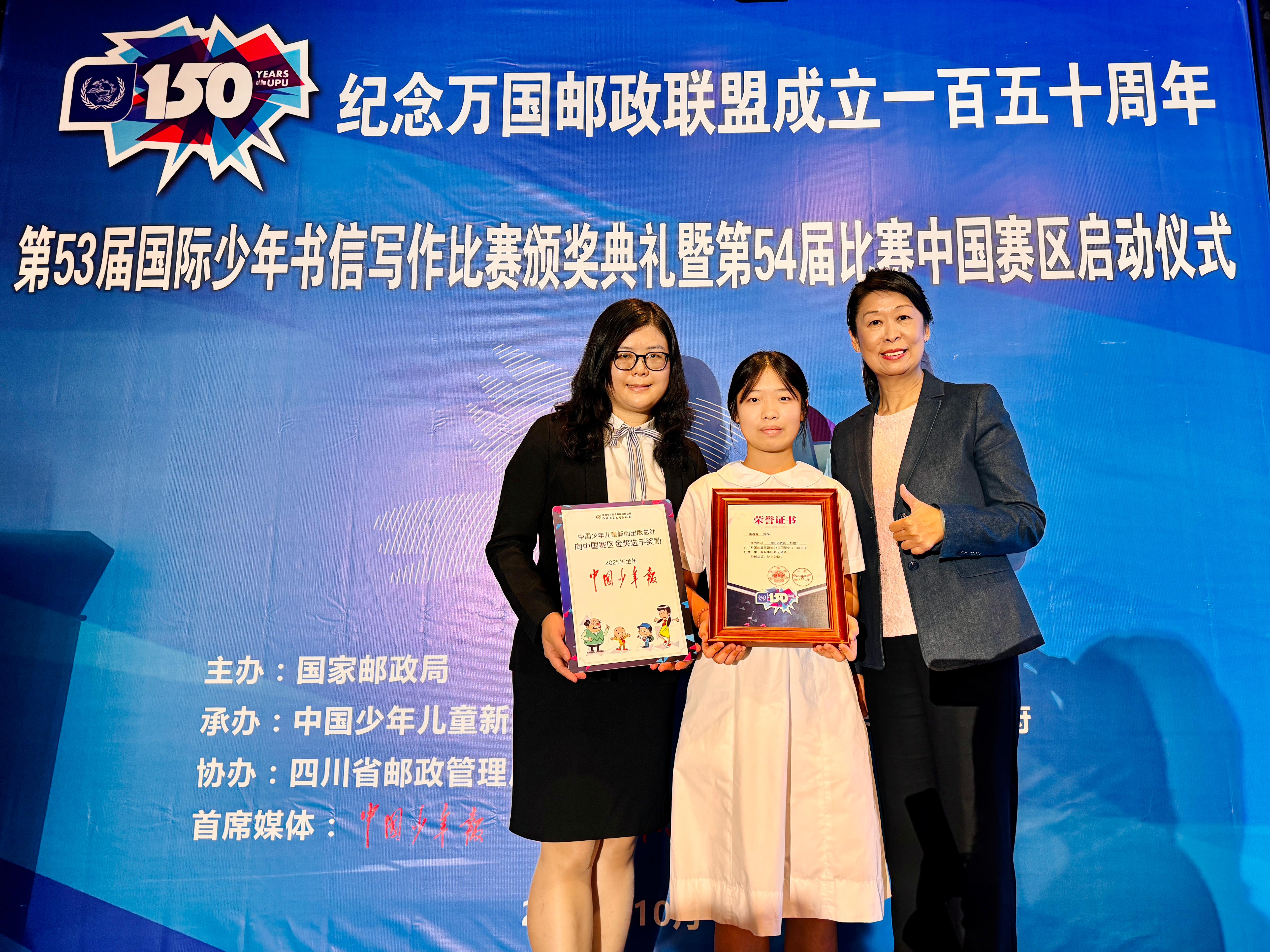 【點新聞報道】萬國郵政聯盟日前舉辦「第53屆國際少年書信寫作比賽」,香港賽區冠軍、麗澤中學凌睿雯同學今日(25日)在成都獲頒中國賽區金獎,麗澤中學王詠楠老師亦獲得中國賽區優秀輔導獎。
